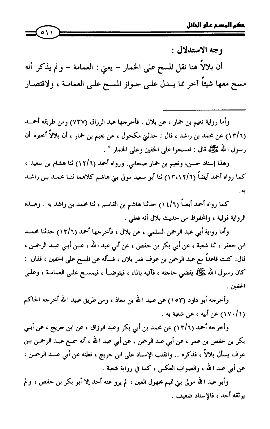 وأما رواية أبي عبد الرحمن السلمي، عن بلال، فأخرجها أحمد (٦/ ١٣) حدثنا محمد ابن جعفر، ثنا شعبة، عن أبي بكر بن حفص، عن أبي عبد الله، عن أبي عبد الرحمن، قال: كنت قاعداً مع عبد الرحمن بن عوف فمر بلال، فسأله عن المسح على الخفين، فقال: كان رسول الله - صلى الله عليه وسلم - يقضي حاجته، فآتيه بالماء، فيتوضأ، فيمسح على العمامة، وعلى الخفين.