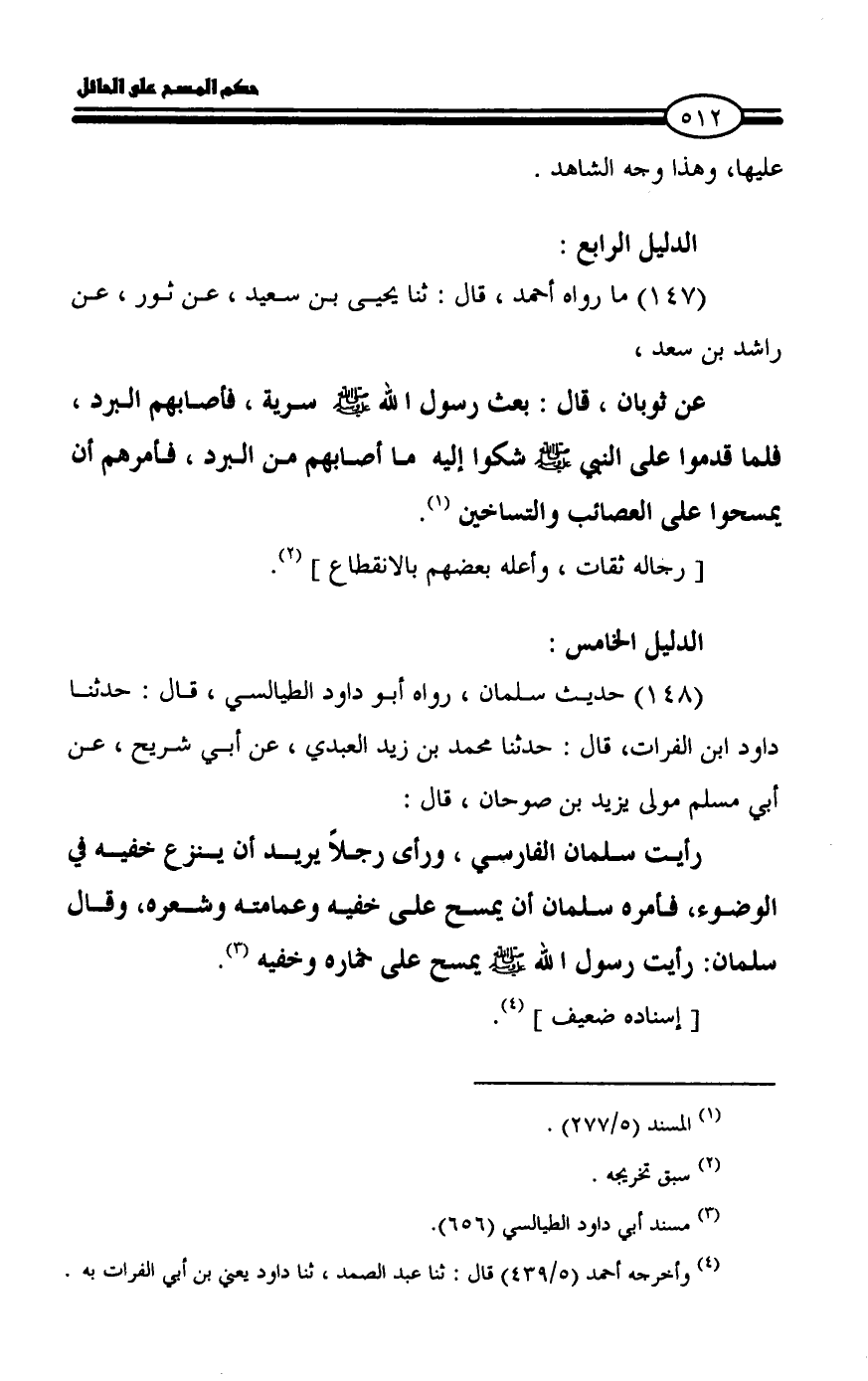 عن ثوبان، قال: بعث رسول الله - صلى الله عليه وسلم - سرية، فأصابهم البرد، فلما قدموا على النبي - صلى الله عليه وسلم - شكوا إليه ما أصابهم من البرد، فأمرهم أن يمسحوا على العصائب والتساخين (¬١).