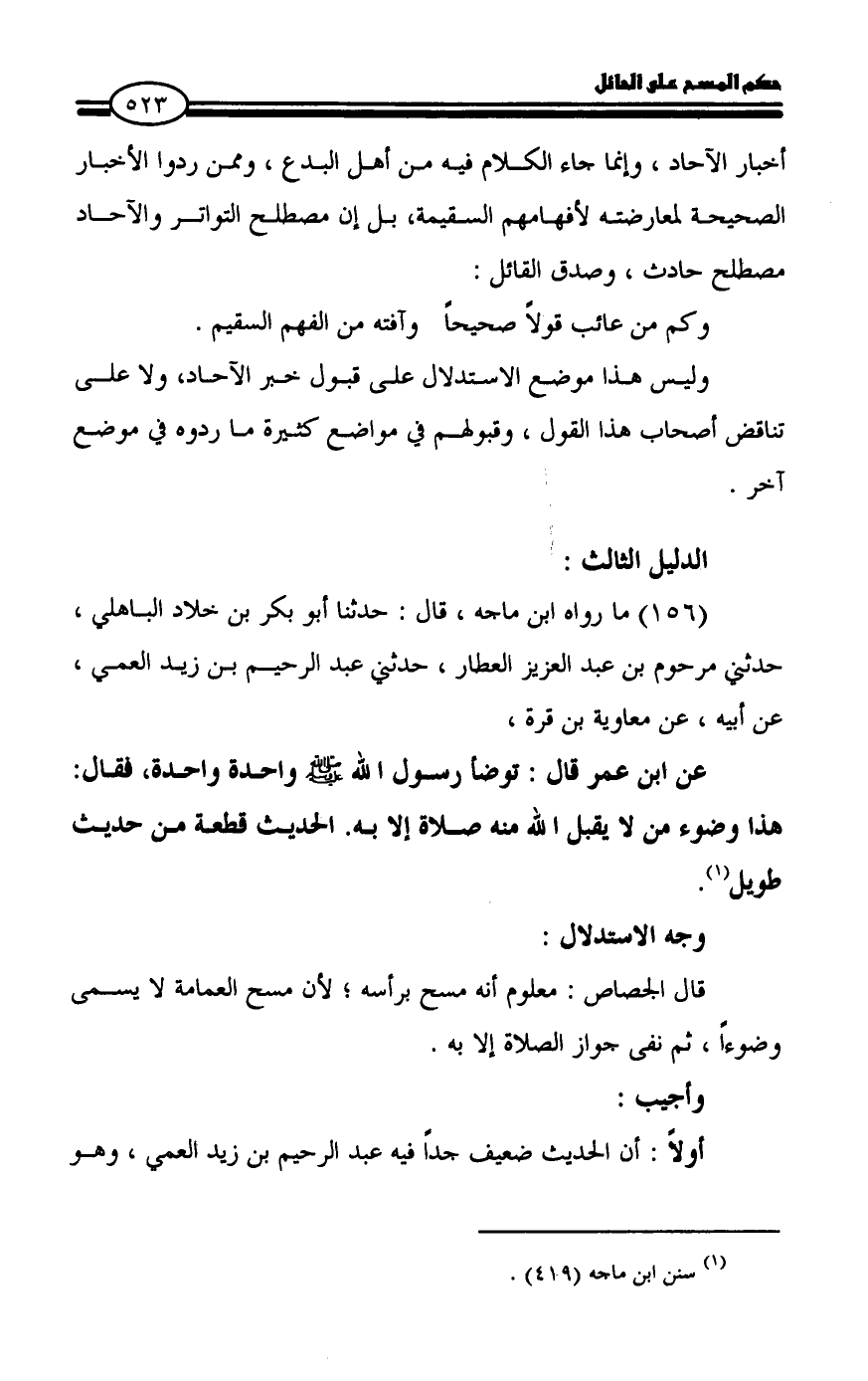 قال الجصاص: معلوم أنه مسح برأسه؛ لأن مسح العمامة لا يسمى وضوءاً، ثم نفى جواز الصلاة إلا به.