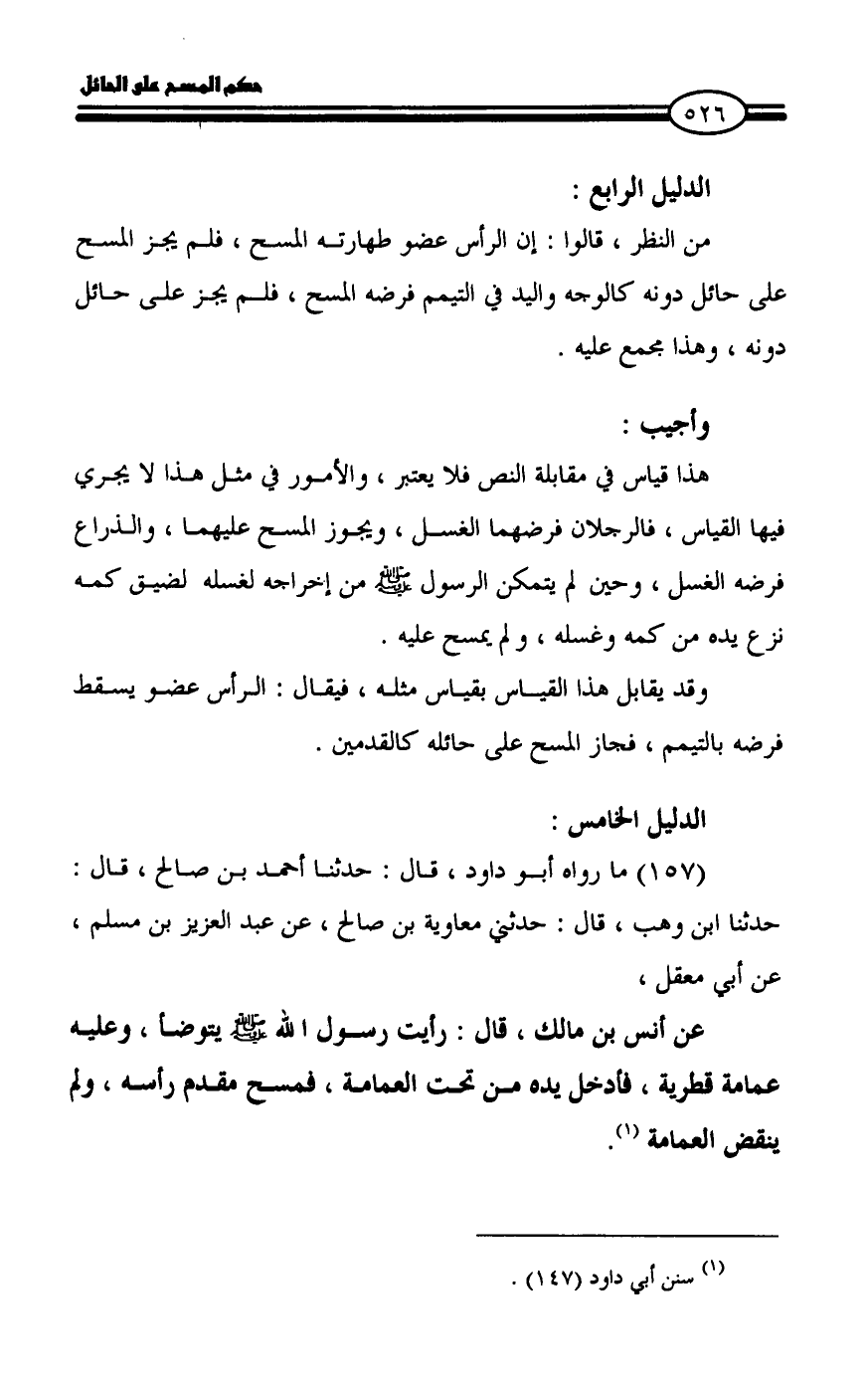 عن أنس بن مالك، قال: رأيت رسول الله - صلى الله عليه وسلم - يتوضأ، وعليه عمامة قطرية، فأدخل يده من تحت العمامة، فمسح مقدم رأسه، ولم ينقض العمامة (¬١).