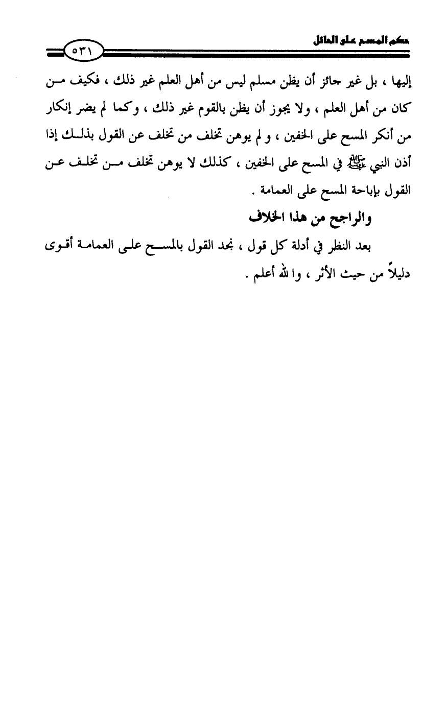 إليها، بل غير جائز أن يظن مسلم ليس من أهل العلم غير ذلك، فكيف من كان من أهل العلم، ولا يجوز أن يظن بالقوم غير ذلك، وكما لم يضر إنكار من أنكر المسح على الخفين، ولم يوهن تخلف من تخلف عن القول بذلك إذا أذن النبي - صلى الله عليه وسلم - في المسح على الخفين، كذلك لا يوهن تخلف من تخلف عن القول بإباحة المسح على العمامة.