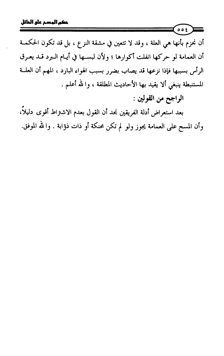 أن نجزم بأنها هي العلة، وقد لا تتعين في مشقة النزع، بل قد تكون الحكمة أن العمامة لو حركها انفلت أكوارها؛ ولأن لبسها في أيام البرد قد يعرق الرأس بسببها فإذا نزعها قد يصاب بضرر بسبب الهواء البارد، المهم أن العلة المستنبطة ينبغي ألا يقيد بها الأحاديث المطلقة، والله أعلم.