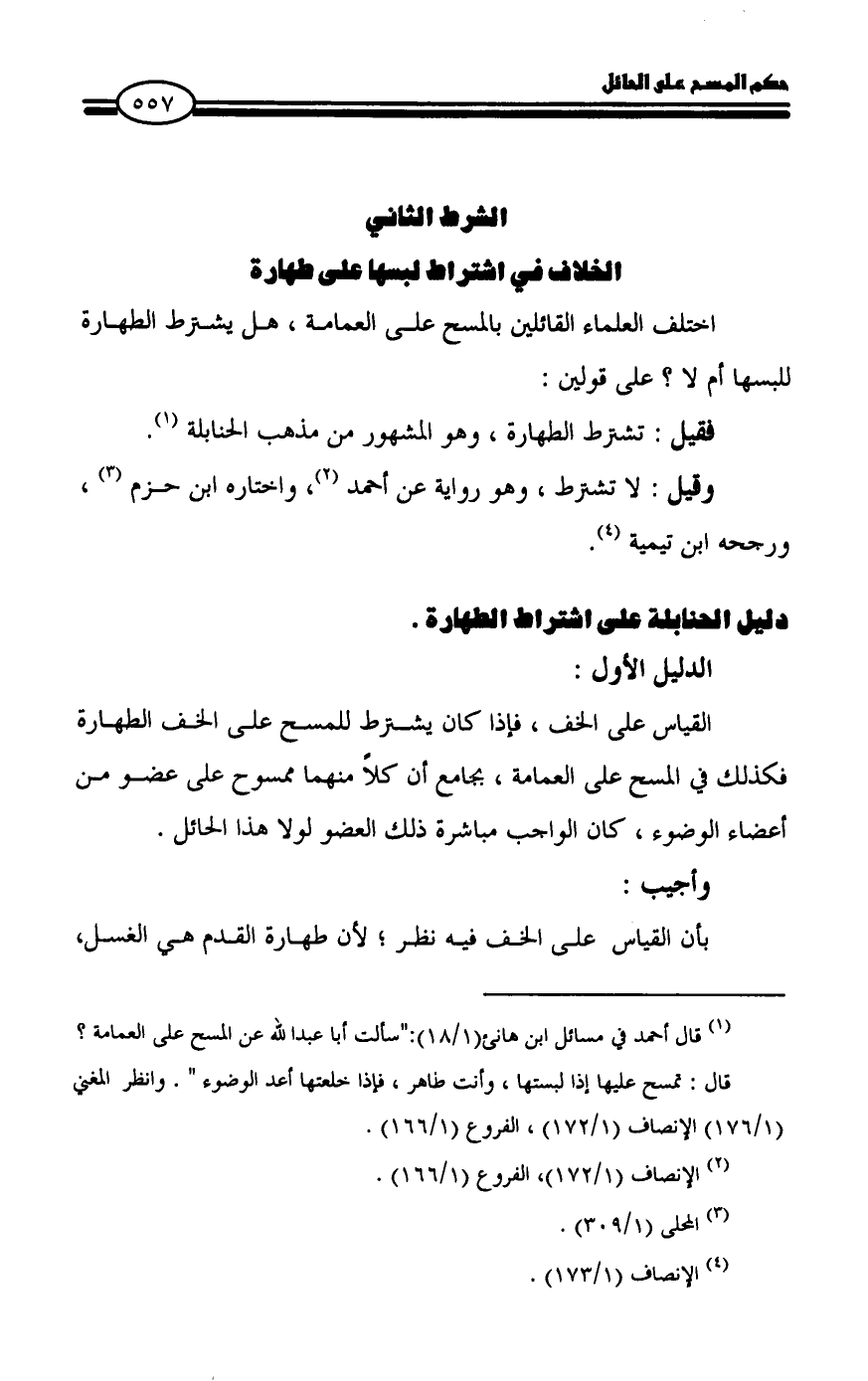 (¬١) قال أحمد في مسائل ابن هانئ (١/ ١٨):"سألت أبا عبد الله عن المسح على العمامة؟