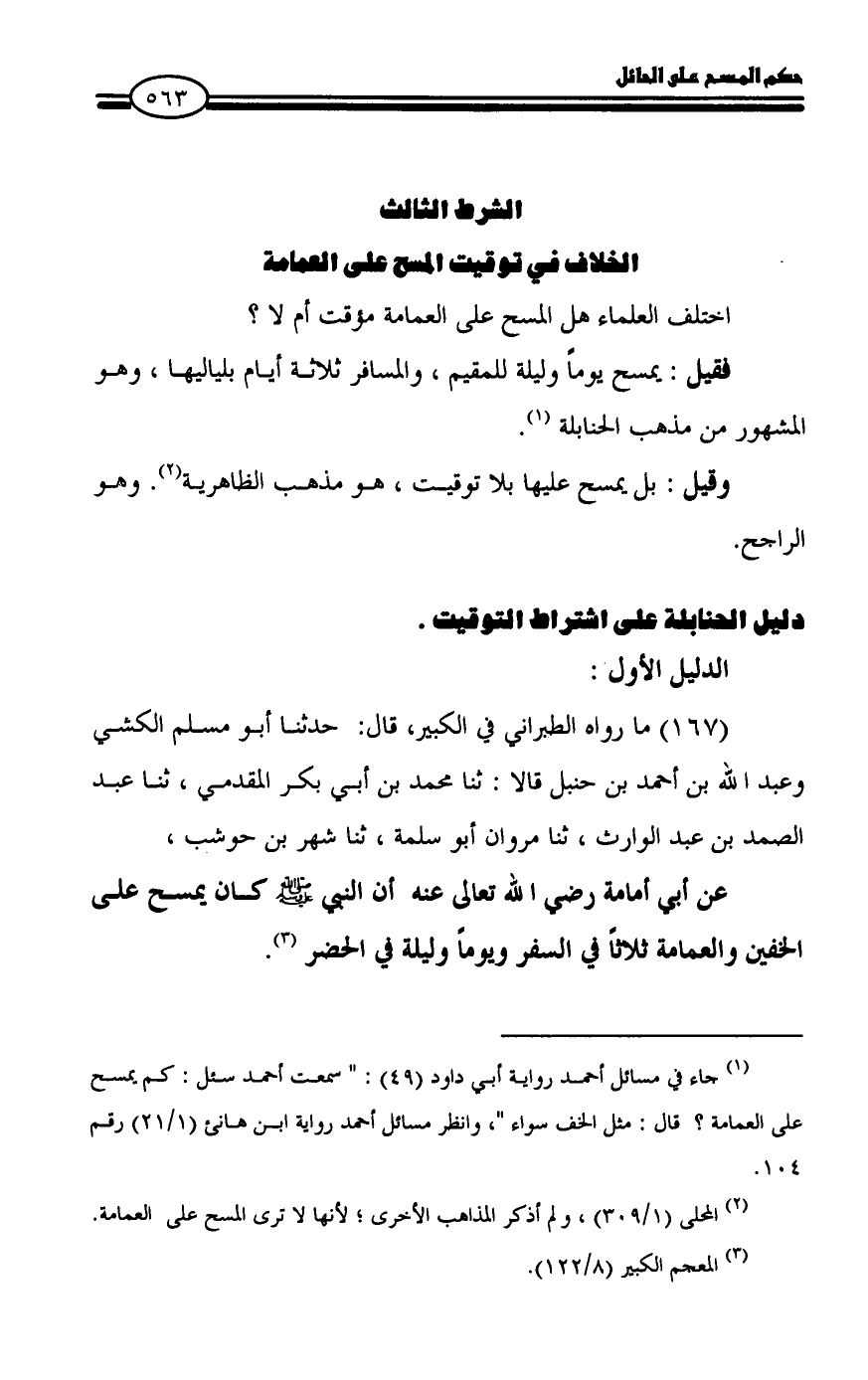 عن أبي أمامة رضي الله تعالى عنه أن النبي - صلى الله عليه وسلم - كان يمسح على الخفين والعمامة ثلاثاً في السفر ويوماً وليلة في الحضر (¬٣).
