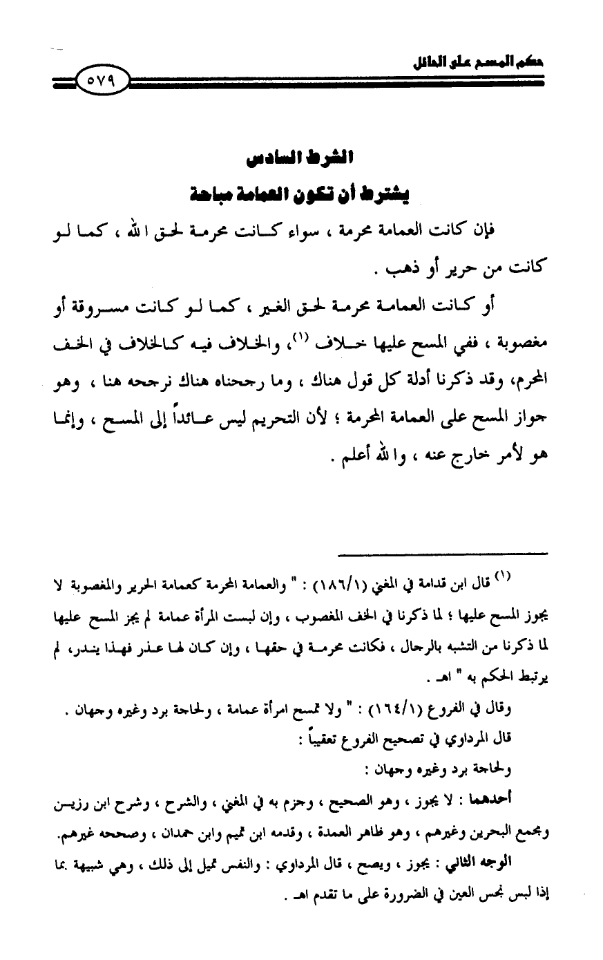 أو كانت العمامة محرمة لحق الغير، كما لو كانت مسروقة أو مغصوبة، ففي المسح عليها خلاف (¬١)، والخلاف فيه كالخلاف في الخف المحرم، وقد ذكرنا أدلة كل قول هناك، وما رجحناه هناك نرجحه هنا، وهو جواز المسح على العمامة المحرمة؛ لأن التحريم ليس عائداً إلى المسح، وإنما هو لأمر خارج عنه، والله أعلم.