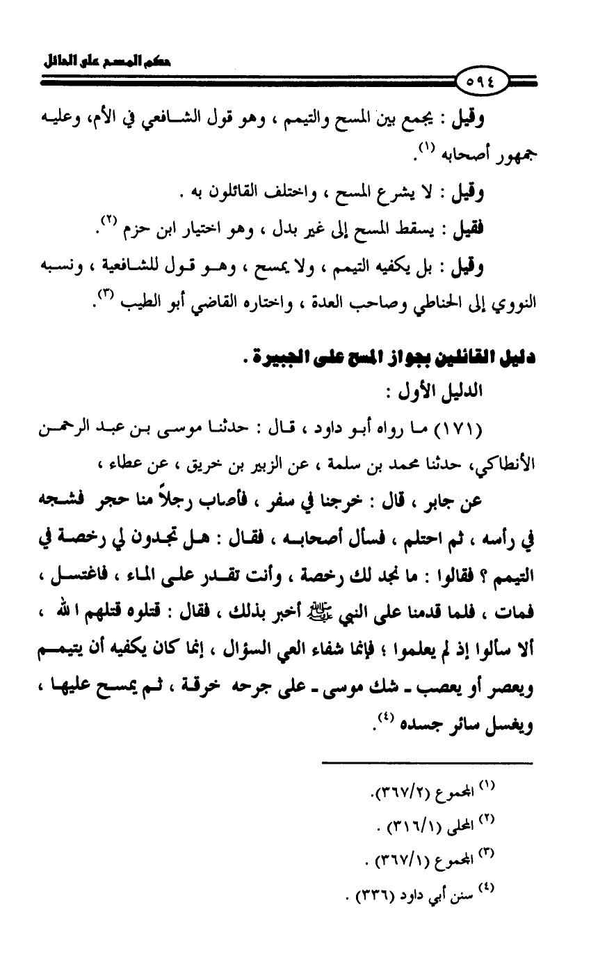 عن جابر، قال: خرجنا في سفر، فأصاب رجلاً منا حجر فشجه في رأسه، ثم احتلم، فسأل أصحابه، فقال: هل تجدون لي رخصة في التيمم؟ فقالوا: ما نجد لك رخصة، وأنت تقدر على الماء، فاغتسل، فمات، فلما قدمنا على النبي - صلى الله عليه وسلم - أخبر بذلك، فقال: قتلوه قتلهم الله، ألا سألوا إذ لم يعلموا؛ فإنما شفاء العي السؤال، إنما كان يكفيه أن يتيمم ويعصر أو يعصب ـ شك موسى ـ على جرحه خرقة، ثم يمسح عليها، ويغسل سائر جسده (¬٤).