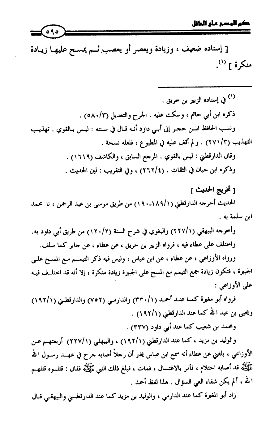 ورواه الأوزاعي، عن عطاء، عن ابن عباس، وليس فيه ذكر التيمم مع المسح على الجبيرة، فتكون زيادة جمع التيمم مع المسح على الجبيرة زيادة منكرة، إلا أنه قد اختلف فيه على الأوزاعي: