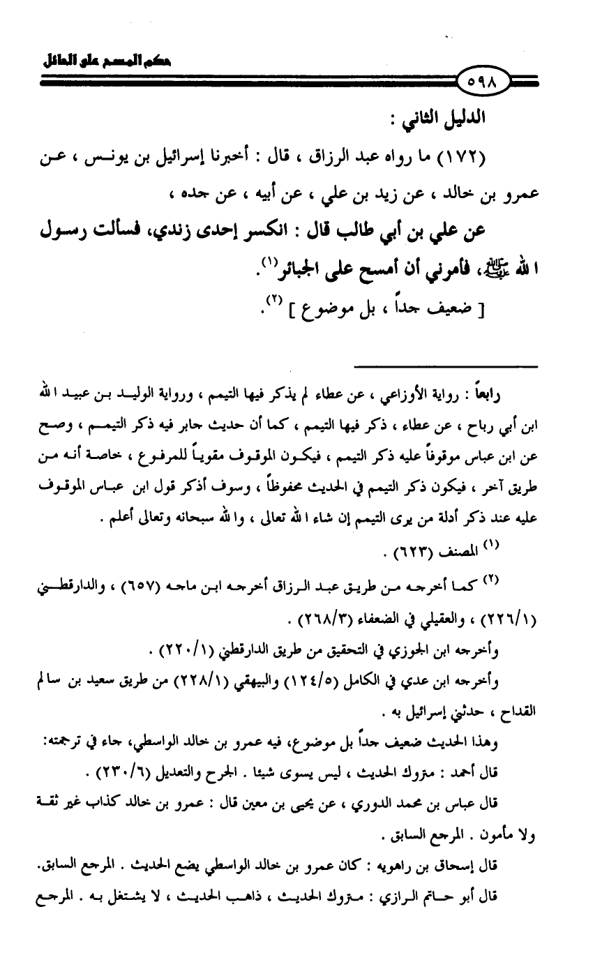 (١٧٢) ما رواه عبد الرزاق، قال: أخبرنا إسرائيل بن يونس، عن عمرو بن خالد، عن زيد بن علي، عن أبيه، عن جده،