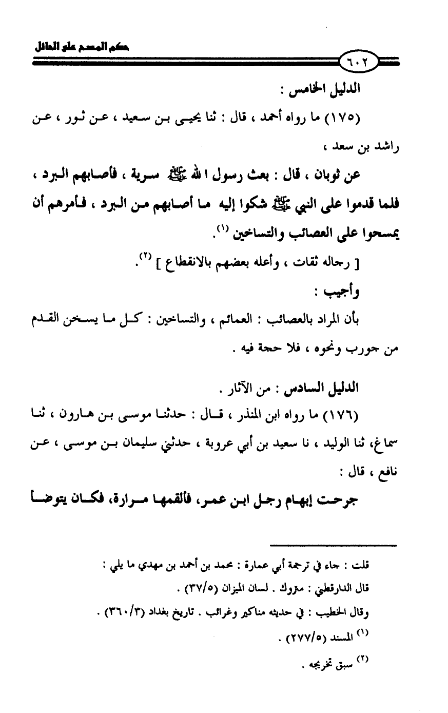عن ثوبان، قال: بعث رسول الله - صلى الله عليه وسلم - سرية، فأصابهم البرد، فلما قدموا على النبي - صلى الله عليه وسلم - شكوا إليه ما أصابهم من البرد، فأمرهم أن يمسحوا على العصائب والتساخين (¬١).