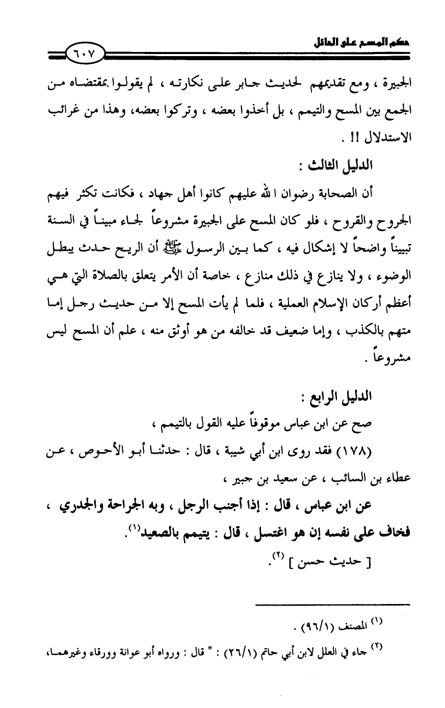 الجبيرة، ومع تقديمهم لحديث جابر على نكارته، لم يقولوا بمقتضاه من الجمع بين المسح والتيمم، بل أخذوا بعضه، وتركوا بعضه، وهذا من غرائب الاستدلال!!.