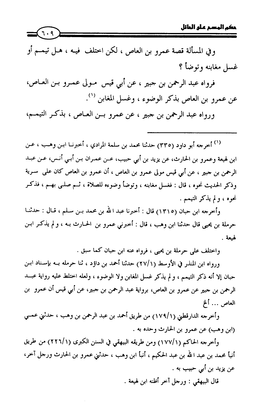 (¬١) أخرجه أبو داود (٣٣٥) حدثنا محمد بن سلمة المرادي، أخبرنا ابن وهب، عن ابن لهيعة وعمرو بن الحارث، عن يزيد بن أبي حبيب، عن عمران بن أبي أنس، عن عبد الرحمن بن جبير، عن أبي قيس مولى عمرو بن العاص، أن عمرو بن العاص كان على سرية وذكر الحديث نحوه، قال: فغسل مغابنه، وتوضأ وضوءه للصلاة، ثم صلى بهم، فذكر نحوه، ولم يذكر التيمم.