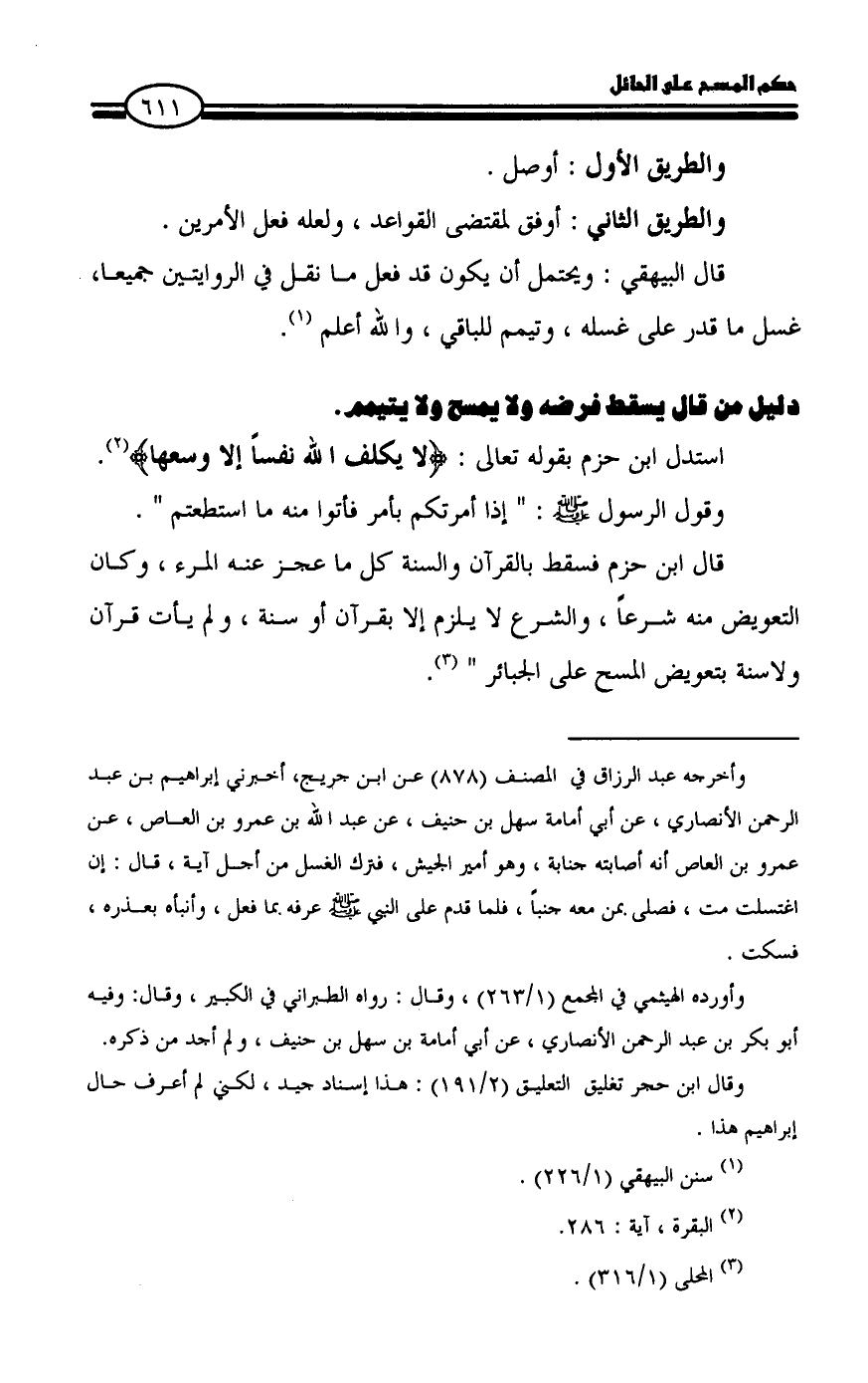 قال ابن حزم فسقط بالقرآن والسنة كل ما عجز عنه المرء، وكان التعويض منه شرعاً، والشرع لا يلزم إلا بقرآن أو سنة، ولم يأت قرآن ولاسنة بتعويض المسح على الجبائر " (¬٣).