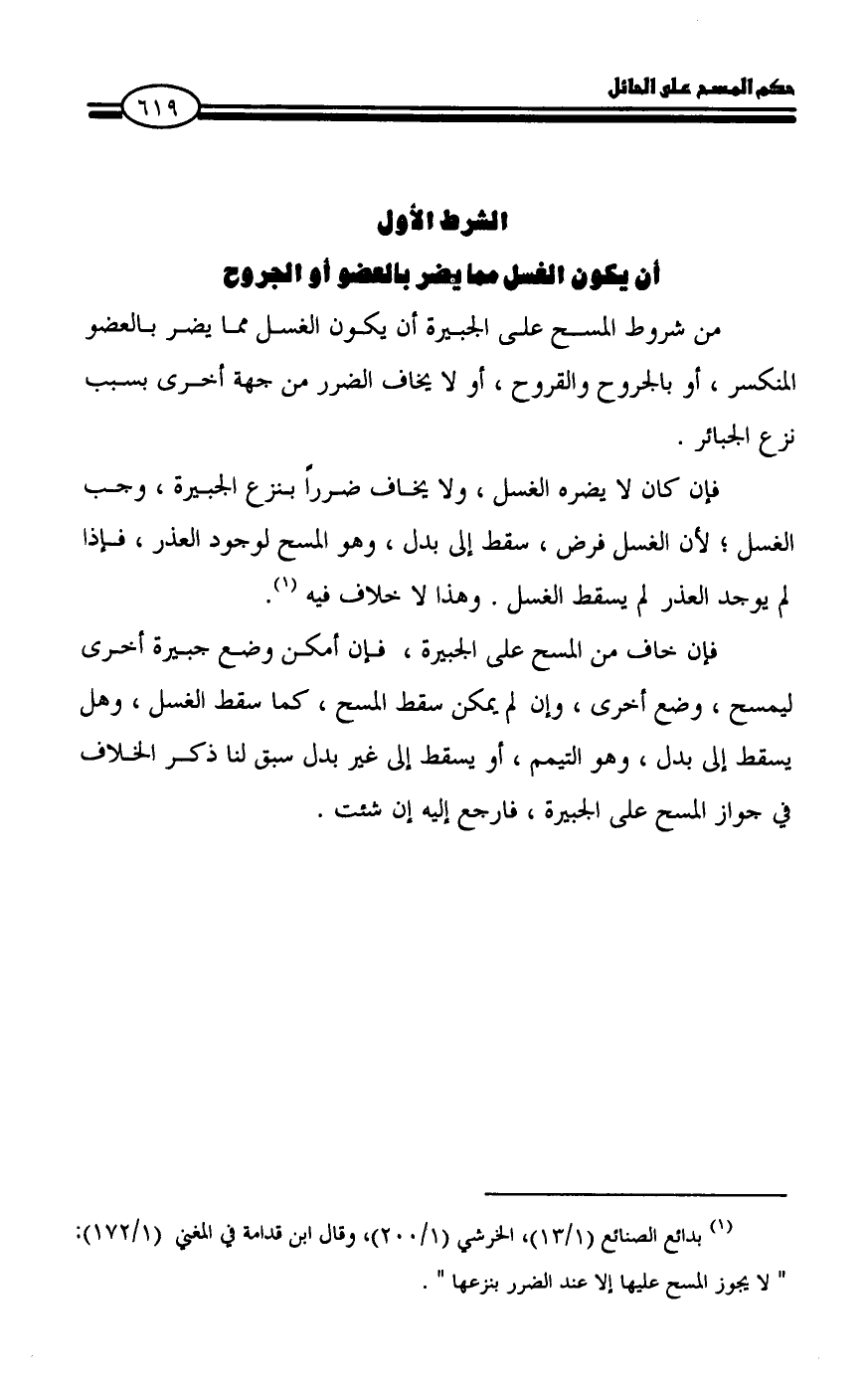 (¬١) بدائع الصنائع (١/ ١٣)، الخرشي (١/ ٢٠٠)، وقال ابن قدامة في المغني (١/ ١٧٢): " لا يجوز المسح عليها إلا عند الضرر بنزعها ".