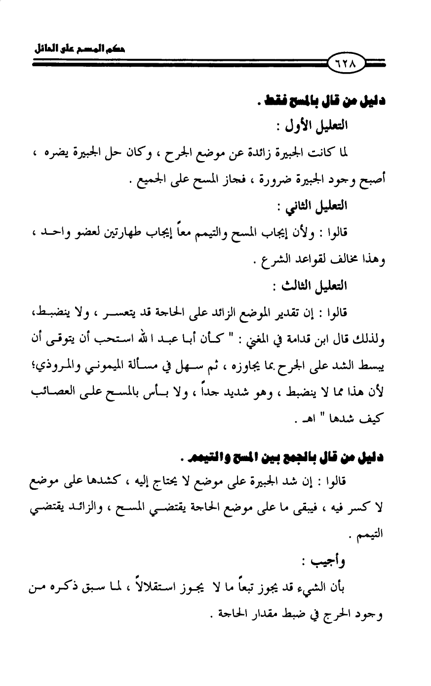 قالوا: ولأن إيجاب المسح والتيمم معاً إيجاب طهارتين لعضو واحد، وهذا مخالف لقواعد الشرع.