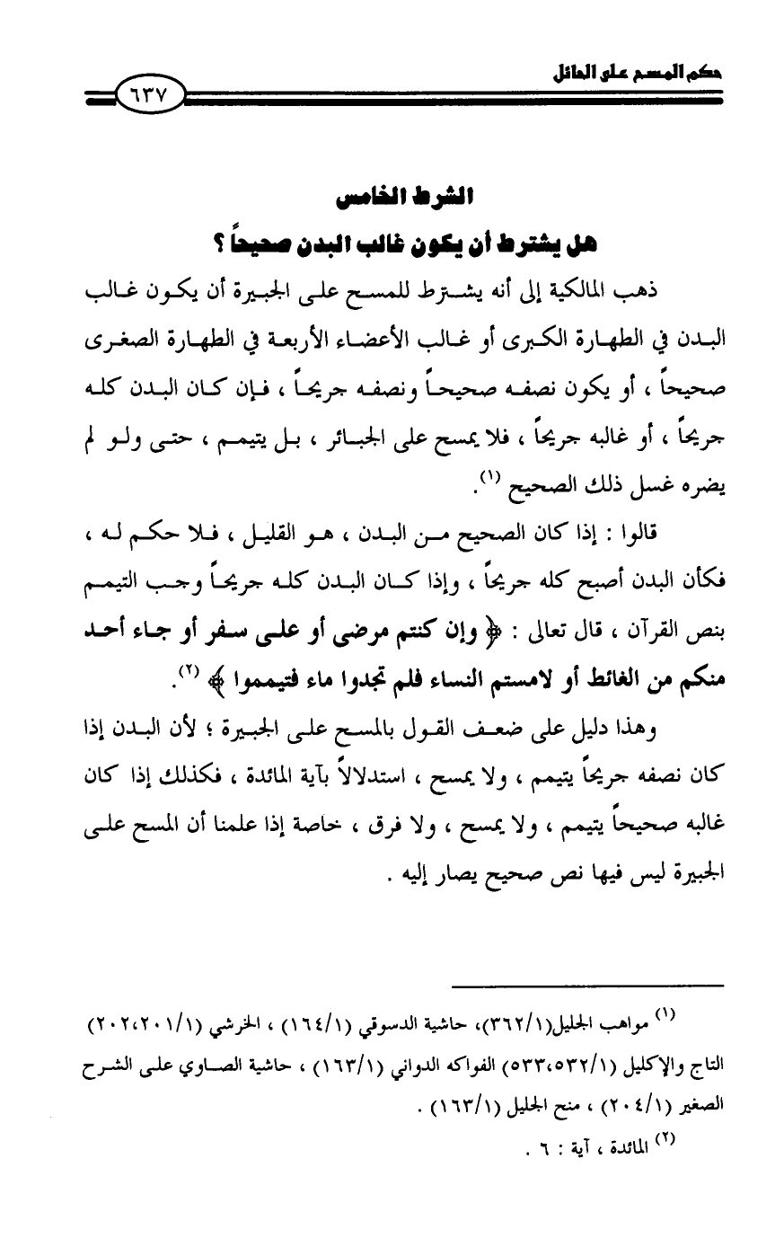 (¬١) مواهب الجليل (١/ ٣٦٢)، حاشية الدسوقي (١/ ١٦٤)، الخرشي (١/ ٢٠١،٢٠٢) التاج والإكليل (١/ ٥٣٢،٥٣٣) الفواكه الدواني (١/ ١٦٣)، حاشية الصاوي على الشرح الصغير (١/ ٢٠٤)، منح الجليل (١/ ١٦٣).