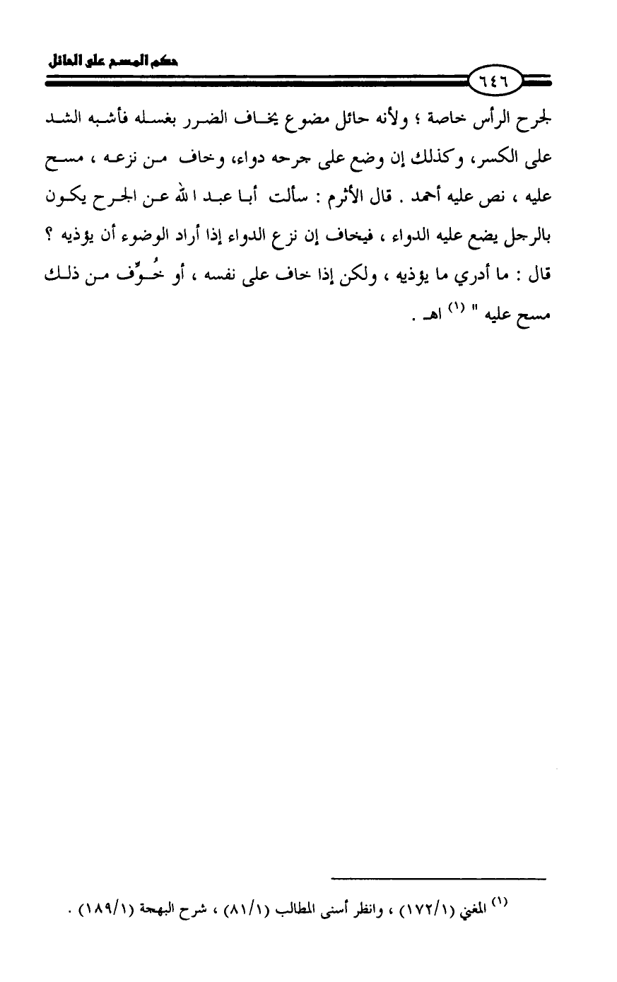 لجرح الرأس خاصة؛ ولأنه حائل مضوع يخاف الضرر بغسله فأشبه الشد على الكسر، وكذلك إن وضع على جرحه دواء، وخاف من نزعه، مسح عليه، نص عليه أحمد. قال الأثرم: سألت أبا عبد الله عن الجرح يكون بالرجل يضع عليه الدواء، فيخاف إن نزع الدواء إذا أراد الوضوء أن يؤذيه؟ قال: ما أدري ما يؤذيه، ولكن إذا خاف على نفسه، أو خُوِّف من ذلك مسح عليه " (¬١) اهـ.