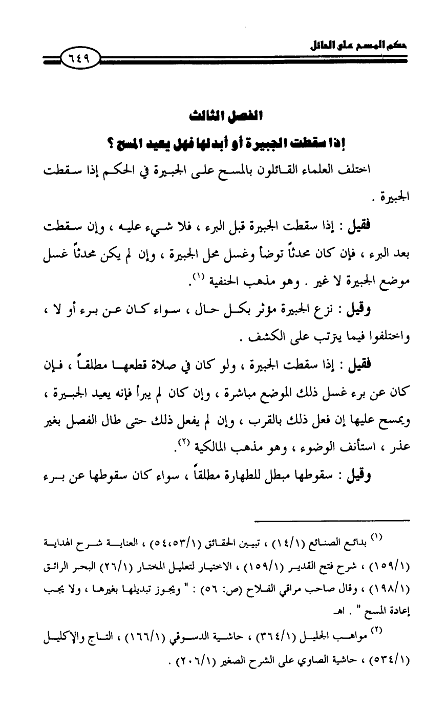 (¬١) بدائع الصنائع (١/ ١٤)، تبيين الحقائق (١/ ٥٣،٥٤)، العناية شرح الهداية (١/ ١٥٩)، شرح فتح القدير (١/ ١٥٩)، الاختيار لتعليل المختار (١/ ٢٦) البحر الرائق (١/ ١٩٨)، وقال صاحب مراقي الفلاح (ص: ٥٦): " ويجوز تبديلها بغيرها، ولا يجب إعادة المسح ". اهـ