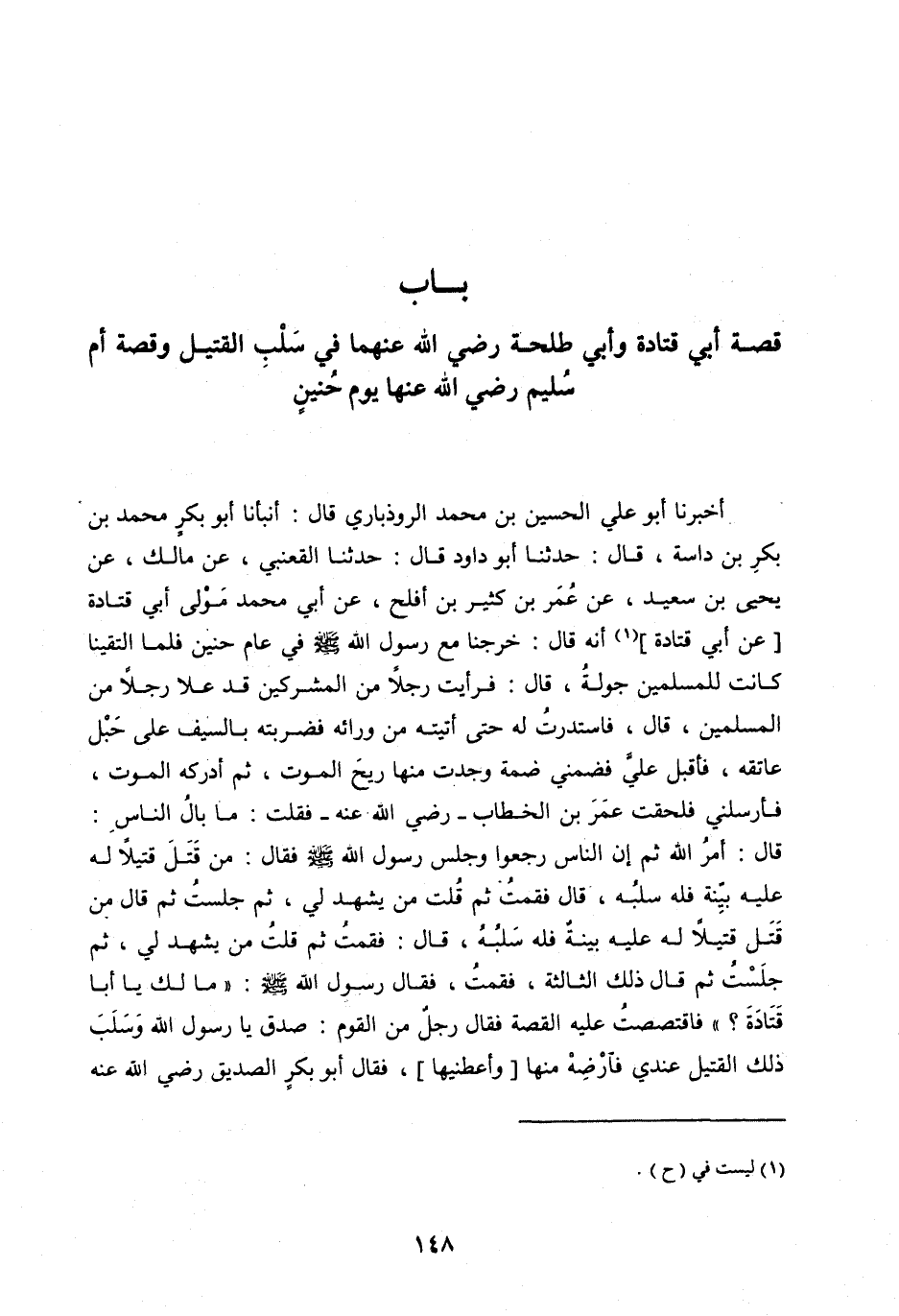بَابُ قِصَّةِ أَبِي قَتَادَةَ وَأَبِي طَلْحَةَ رَضِيَ اللهُ عَنْهُمَا فِي سَلَبِ الْقَتِيلِ وَقِصَّةِ أُمِّ سُلَيْمٍ رَضِيَ اللهُ عَنْهَا يَوْمَ حُنَيْنٍ