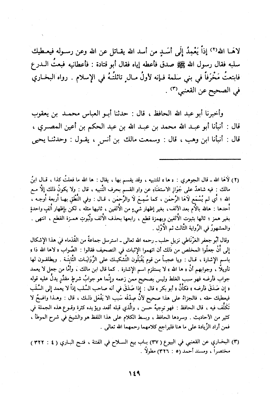 وقال أبو جعفر الغرناطي نزيل حلب- رحمه الله تعالى- استرسل جماعة من القدماء في هذا الإشكال إلى أن جعلوا المخلص من ذلك أن اتهموا الإثبات في التصحيف فقالوا: الصّواب «لا ها الله ذا» باسم الإشارة، قال: ويا عجبا من قوم يقبلون التّشكيك على الرّوايات الثّابتة. ويطلقون لها تأويلا، وجوابهم أنّ «ها الله» لا يستلزم اسم الإشارة. كما قال ابن مالك، وأمّا من جعل لا يعمد جواب فأرضه فهو سبب الغلط وليس بصحيح ممن زعمه وإنّما هو جواب شرط مقدّر يدلّ عليه قوله «إن صدق فأرضه» فكأنّ «أبو بكر» قال: إذا صدق في أنه صاحب السّلب إذا لا يعمد إلى السّلب فيعطيك حقه، فالجزاء على هذا صحيح لأنّ صدقه سبب الا يفعل ذلك، قال: وهذا واضح لا تكلّف فيه، قال الحافظ: فهو توجيه حسن، والّذي قبله أقعد ويؤيده كثرة وقوع هذه الجملة في كثير من الأحاديث. وسردها الحافظ، وبسط الكلام على هذا اللفظ هو والشيخ في شرح الموطأ، فمن أراد الزّيادة على ما هنا فليراجع كلامهما رحمهما الله تعالى.