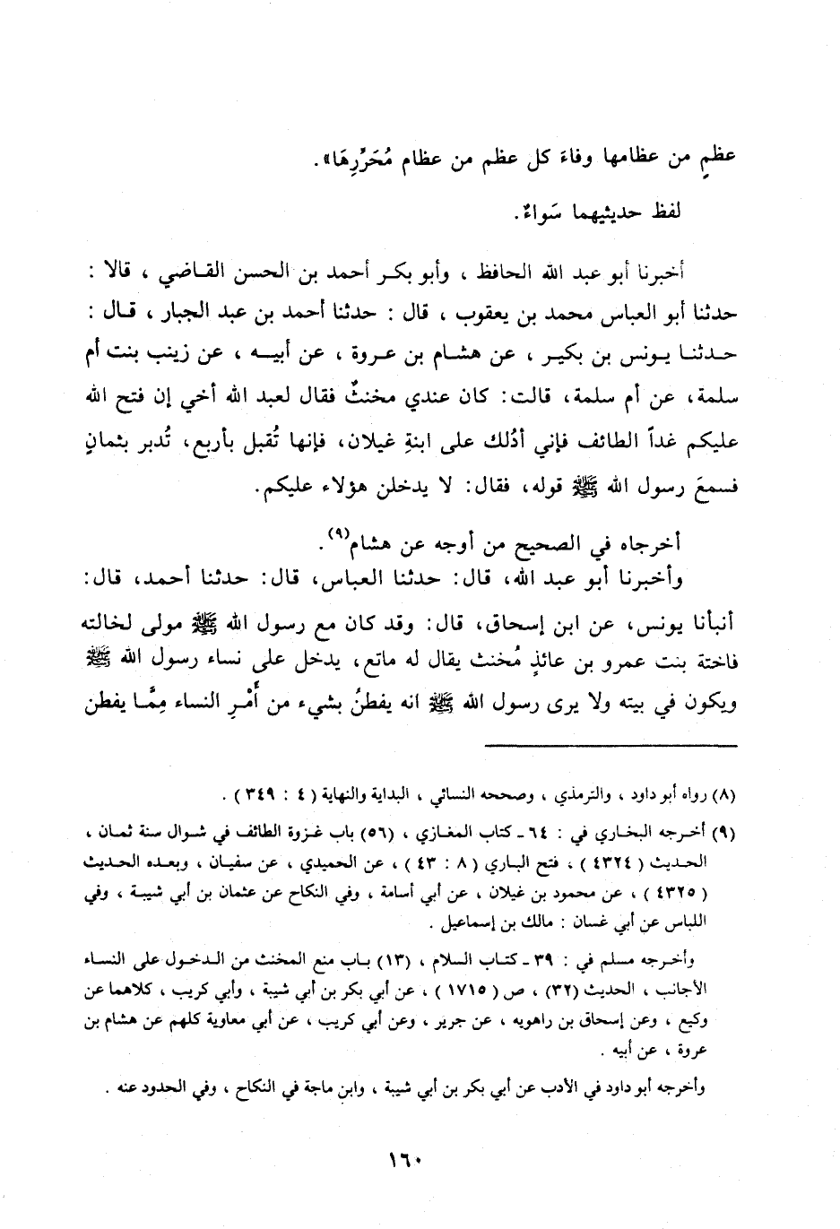 حَدَّثَنَا يُونُسُ بْنُ بُكَيْرٍ، عَنْ هِشَامِ بْنِ عُرْوَةَ، عَنْ أَبِيهِ، عَنْ زَيْنَبَ بِنْتِ أُمِّ سَلَمَةَ، عَنْ أُمِّ سَلَمَةَ، قَالَتْ: كَانَ عِنْدِي مُخَنَّثٌ فَقَالَ لِعَبْدِ اللهِ أَخِي إِنْ فَتَحَ اللهُ عَلَيْكُمْ غَدًا الطَّائِفَ فَإِنِّي أَدُلُّكَ عَلَى ابْنَةِ غَيْلَانَ، فَإِنَّهَا تُقْبِلُ بِأَرْبَعٍ، وَتُدْبِرُ بِثَمَانٍ فَسَمِعَ رَسُولُ اللهِ صَلَّى اللهُ عَلَيْهِ وسلم قَوْلَهُ، فَقَالَ: لَا يَدْخُلَنَّ هَؤُلَاءِ عَلَيْكُمْ.