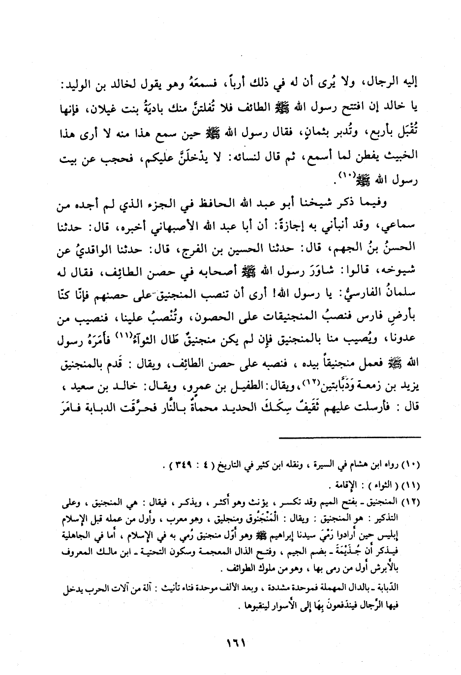 وفِيمَا ذَكَرَ شَيْخُنَا أَبُو عَبْدِ اللهِ الْحَافِظُ فِي الْجُزْءِ الَّذِي لَمْ أَجِدْهُ مِنْ سَمَاعِي، وَقَدْ أَنْبَأَنِي بِهِ إِجَازَةً: أَنَّ أَبَا عَبْدِ اللهِ الْأَصْبَهَانِيَّ أَخْبَرَهُ، قَالَ: حَدَّثَنَا الْحَسَنُ بْنُ الْجَهْمِ، قَالَ: حَدَّثَنَا الْحُسَيْنُ بْنُ الْفَرَجِ، قَالَ: حَدَّثَنَا الْوَاقِدِيُّ عَنْ شُيُوخِهِ، قَالُوا: شَاوَرَ رَسُولُ اللهِ صلى الله عليه وَسَلَّمَ أَصْحَابَهُ فِي حِصْنِ الطَّائِفِ، فَقَالَ لَهُ سَلْمَانُ الْفَارِسِيُّ: يَا رَسُولَ اللهِ! أَرَى أَنْ تَنْصِبَ الْمَنْجَنِيقَ عَلَى حِصْنِهِمْ فَإِنَّا كُنَّا بِأَرْضِ فَارِسَ فنصب الْمَنْجَنِيقَاتِ عَلَى الْحُصُونِ، وَتُنْصَبُ عَلَيْنَا، فَنُصِيبُ مِنْ عَدُوِّنَا، وَيُصِيبُ مِنَّا بِالْمَنْجَنِيقِ فَإِنْ لَمْ يَكُنْ مَنْجَنِيقٌ طَالَ الثَّوَاءُ [ (11) ] فَأَمَرَهُ رَسُولُ اللهِ صَلَّى اللهُ عَلَيْهِ وسلم فَعَمِلَ مَنْجَنِيقًا بِيَدِهِ، فَنَصَبَهُ عَلَى حِصْنِ الطَّائِفِ، وَيُقَالُ: قَدِمَ بِالْمَنْجَنِيقِ يَزِيدُ بْنُ زَمْعَةَ وَدَبَّابَتَيْنِ [ (12) ] ، وَيُقَالُ: الطُّفَيْلُ بْنُ عَمْرٍو، وَيُقَالُ: خَالِدُ بْنُ سَعِيدٍ، قَالَ: فَأَرْسَلَتْ عَلَيْهِمْ ثَقِيفٌ سِكَكَ الْحَدِيدِ مُحْمَاةٌ بِالنَّارِ فَحَرَّقَتِ الدَّبَّابَةَ فَأَمَرَ