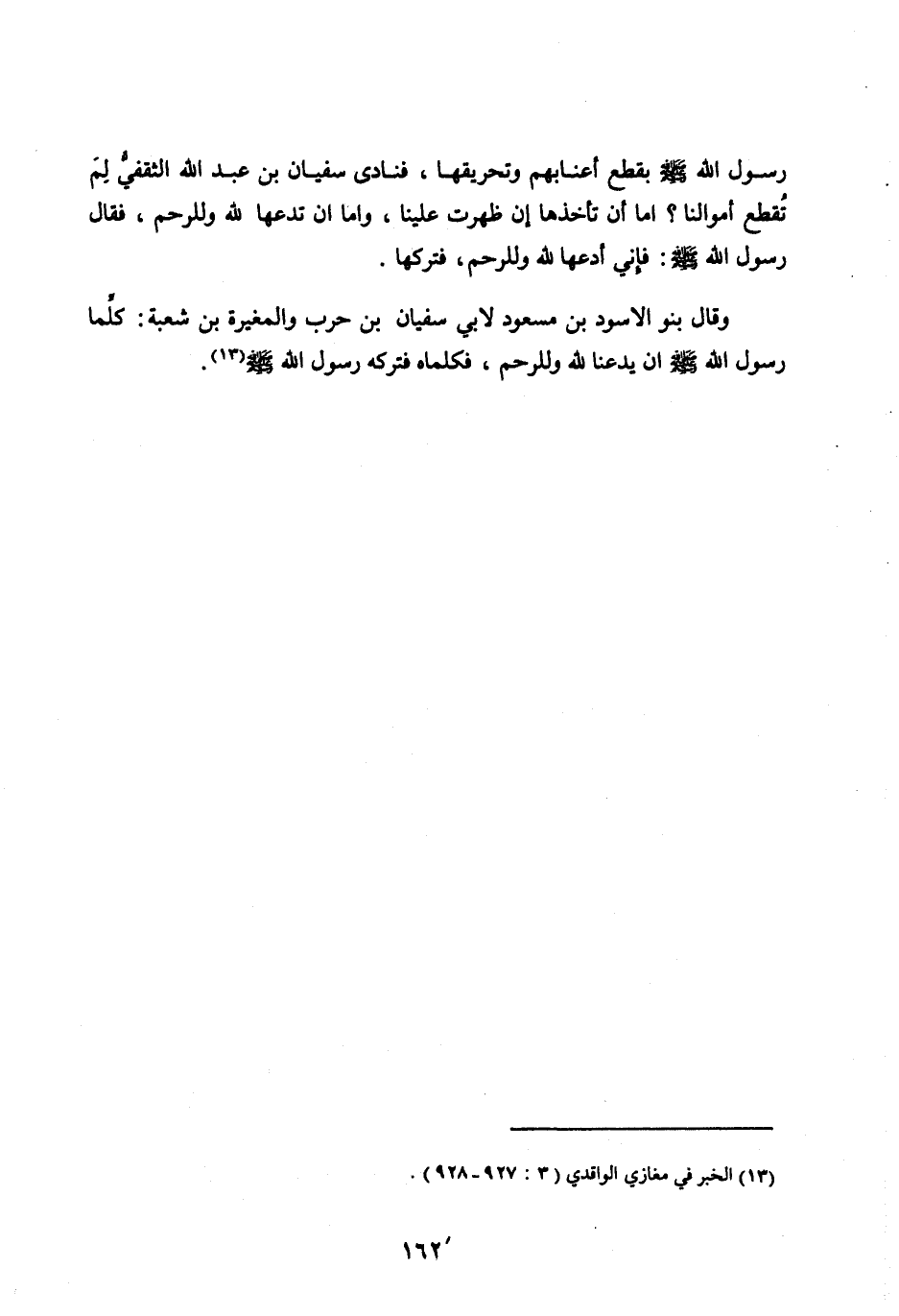 رسول الله صلى الله عَلَيْهِ وَسَلَّمَ بِقَطْعِ أَعْنَابِهِمْ وَتَحْرِيقِهَا، فَنَادَى سُفْيَانُ بْنُ عَبْدِ اللهِ الثَّقَفِيُّ لِمَ تَقْطَعُ أَمْوَالَنَا؟ إِمَّا أَنْ تَأْخُذَهَا إِنْ ظَهَرْتَ عَلَيْنَا، وَإِمَّا أَنْ تَدَعَهَا لِلَّهِ وَلِلرَّحِمِ، فَقَالَ رَسُولُ اللهِ صَلَّى اللهُ عَلَيْهِ وَسَلَّمَ: فَإِنِّي أَدَعُهَا لِلَّهِ وَلِلرَّحِمِ، فَتَرَكَهَا.