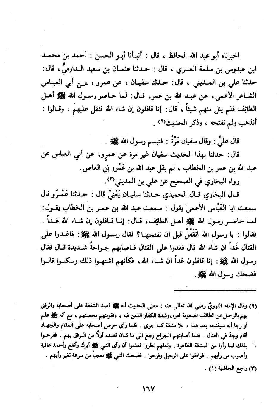 حَدَّثَنَا عَلِيُّ بْنُ الْمَدِينِيِّ، قَالَ: حَدَّثَنَا سُفْيَانُ، عَنْ عَمْرٍو، عَنْ أَبِي الْعَبَّاسِ الشَّاعِرِ الْأَعْمَى، عَنْ عَبْدِ اللهِ بْنِ عُمَرَ، قَالَ: لَمَّا حَاصَرَ رَسُولُ اللهِ صَلَّى الله عليه وسلم أَهْلَ الطَّائِفِ فَلَمْ يَنَلْ مِنْهُمْ شَيْئًا، قَالَ: إِنَّا قَافِلُونَ إِنْ شَاءَ اللهُ فَثَقُلَ عَلَيْهِمْ، وَقَالُوا: