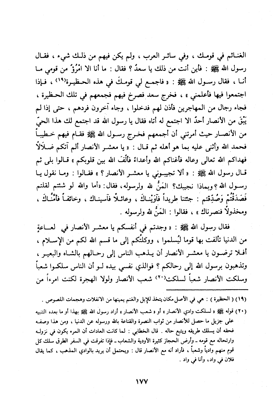 فَقَالَ رَسُولُ اللهِ صَلَّى الله عليه وَسَلَّمَ: «وَجَدْتُمْ فِي أَنْفُسِكُمْ يَا مَعْشَرَ الْأَنْصَارِ فِي لُعَاعَةٍ مِنَ الدُّنْيَا تَأَلَّفْتُ بِهَا قَوْمًا لِيُسْلِمُوا، وَوَكَلْتُكُمْ إِلَى مَا قَسَمَ اللهُ لَكُمْ مِنَ الْإِسْلَامِ، أَفَلَا تَرْضَوْنَ يَا مَعْشَرَ الْأَنْصَارِ أَنْ يَذْهَبَ النَّاسُ إِلَى رِحَالِهِمْ بِالشَّاةِ وَالْبَعِيرِ، وَتَذْهَبُونَ بِرَسُولِ اللهِ إِلَى رِحَالِكُمْ؟ فو الذي نَفْسِي بِيَدِهِ لَوْ أَنَّ النَّاسَ سَلَكُوا شِعْبًا وَسَلَكَتِ الْأَنْصَارُ شِعْبًا لَسَلَكْتُ [ (20) ] شِعْبَ الْأَنْصَارِ وَلَوْلَا الْهِجْرَةُ لَكُنْتُ امرءا من