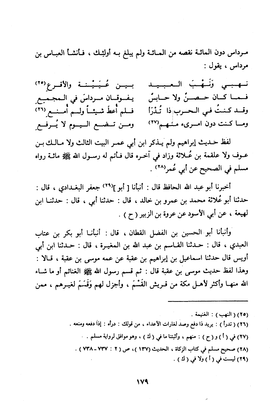 لَفْظُ حَدِيثِ إِبْرَاهِيمَ وَلَمْ يَذْكُرِ ابْنُ أَبِي عُمَرَ الْبَيْتَ الثَّالِثَ وَلَا مَالِكُ بْنُ عَوْفٍ وَلَا عَلْقَمَةُ بْنُ عُلَاثَةَ وَزَادَ فِي آخِرِهِ قَالَ فَأَتَمَّ لَهُ رَسُولُ اللهِ صَلَّى الله عَلَيْهِ وَسَلَّمَ مِائَةً رَوَاهُ مُسْلِمٌ فِي الصَّحِيحِ عَنْ أَبِي عُمَرَ [ (28) ] .