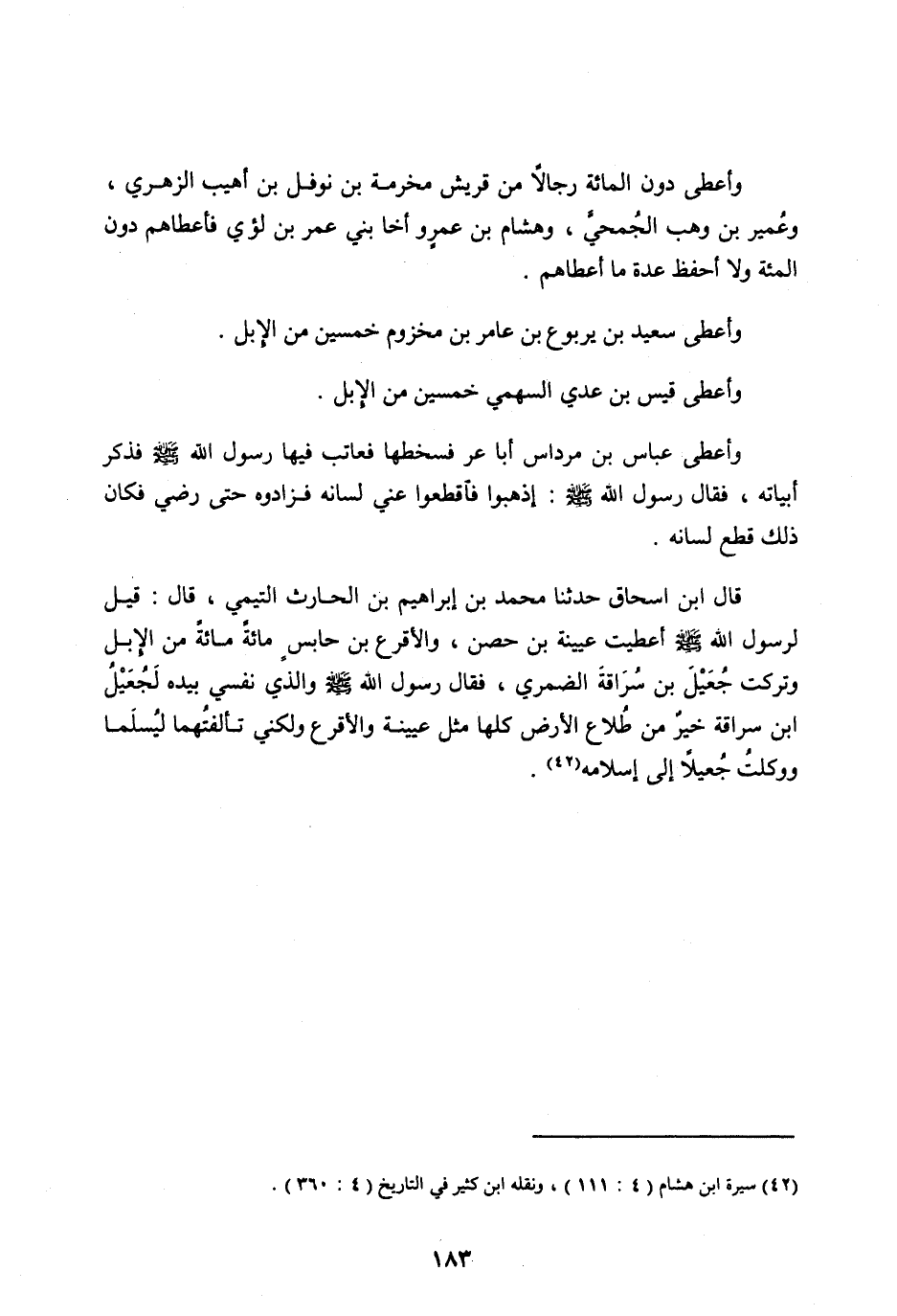قَالَ ابْنُ إِسْحَاقَ حَدَّثَنَا مُحَمَّدُ بْنُ إِبْرَاهِيمَ بْنِ الْحَارِثِ التَّيْمِيُّ، قَالَ: قِيلَ لِرَسُولِ اللهِ صَلَّى اللهُ عَلَيْهِ وسلم أعطيت عُيَيْنَةَ بْنَ حِصْنٍ، وَالْأَقْرَعَ بْنَ حَابِسٍ مِائَةً مِائَةً مِنَ الْإِبِلِ وَتَرَكْتَ جُعَيْلَ بْنَ سُرَاقَةَ الضَّمْرِيَّ، فَقَالَ رَسُولُ اللهِ صَلَّى اللهُ عَلَيْهِ وَسَلَّمَ وَالَّذِي نَفْسِي بيده لجعيل ابن سُرَاقَةَ خَيْرٌ مِنْ طِلَاعِ الْأَرْضِ كُلِّهَا مِثْلَ عُيَيْنَةَ وَالْأَقْرَعِ وَلَكِنِّي تَأَلَّفْتُهُمَا لِيُسْلِمَا وَوَكَلْتُ جُعَيْلًا إِلَى إِسْلَامِهِ [ (42) ] .