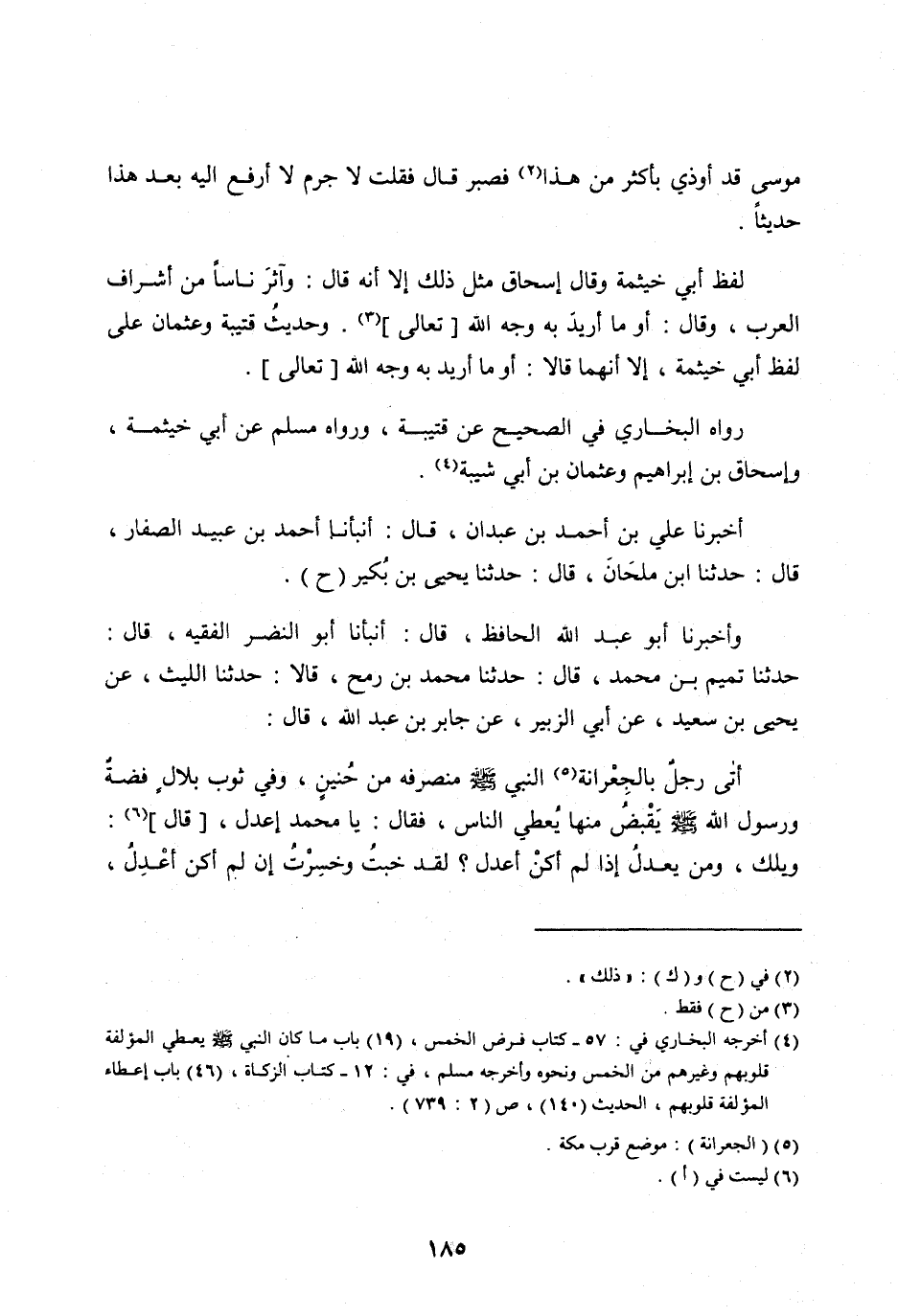 [ (4) ] أخرجه البخاري في: 57- كتاب فرض الخمس، (19) باب ما كَانَ النَّبِيُّ صَلَّى اللهُ عليه وسلم يعطي المؤلفة قلوبهم وغيرهم من الخمس ونحوه وأخرجه مسلم، في: 12- كتاب الزكاة، (46) باب إعطاء المؤلفة قلوبهم، الحديث (140) ، ص (2: 739) .