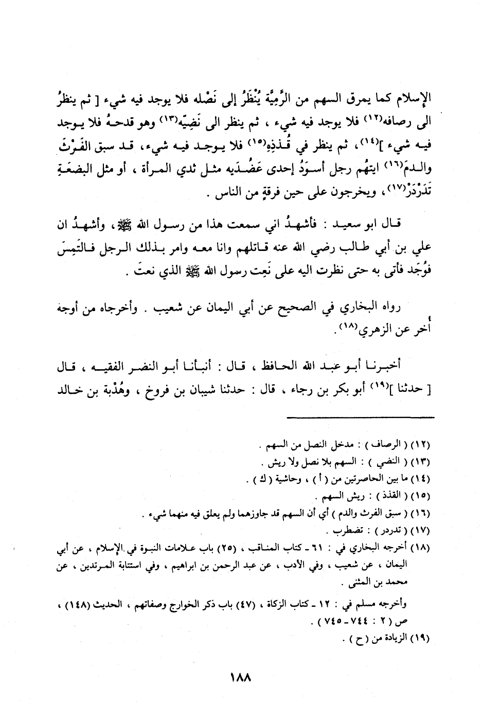 الْإِسْلَامِ كَمَا يَمْرُقُ السَّهْمُ مِنَ الرَّمِيَّةِ يُنْظَرُ إِلَى نَصْلِهِ فَلَا يُوجَدُ فِيهِ شَيْءٌ [ثُمَّ يُنْظَرُ إِلَى رِصَافِهِ [ (12) ] فَلَا يُوجَدُ فِيهِ شَيْءٌ، ثُمَّ يُنْظَرُ إِلَى نَضِيِّهِ [ (13) ] وَهُوَ قِدْحُهُ فَلَا يُوجَدُ فِيهِ شَيْءٌ] [ (14) ] ، ثُمَّ يَنْظُرُ فِي قُذَذِهِ [ (15) ] فَلَا يُوجَدُ فِيهِ شَيْءٌ، قَدْ سَبَقَ الْفَرْثَ وَالدَّمَ [ (16) ] آيَتُهُمْ رَجُلٌ أَسْوَدُ إِحْدَى عَضُدَيْهِ مِثْلُ ثَدْيِ الْمَرْأَةِ، أَوْ مِثْلُ الْبَضْعَةِ تَدَرْدَرُ [ (17) ] ، وَيَخْرُجُونَ عَلَى حِينِ فُرْقَةٍ مِنَ النَّاسِ.