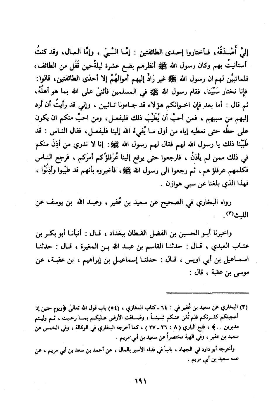 فَإِنَّا نَخْتَارُ سَبْيَنَا، فَقَامَ رَسُولُ اللهِ صَلَّى اللهُ عَلَيْهِ وَسَلَّمَ فِي الْمُسْلِمِينَ فَأَثْنَى عَلَى اللهِ بِمَا هُوَ أَهْلُهُ، ثُمَّ قَالَ: أَمَّا بَعْدُ فَإِنَّ إِخْوَانَكُمْ هَؤُلَاءِ قَدْ جَاءُونَا تَائِبِينَ، وَإِنِّي قَدْ رَأَيْتُ أَنْ أَرُدَّ إِلَيْهِمْ مِنْ سَبْيِهِمْ، فَمَنْ أَحَبَّ أَنْ يُطَيِّبَ ذَلِكَ فَلْيَفْعَلْ، وَمَنْ أَحَبَّ مِنْكُمْ أَنْ يَكُونَ عَلَى حَظِّهِ حَتَّى نُعْطِيَهُ إِيَّاهُ مِنْ أَوَّلِ مَا يُفِيءُ اللهُ إِلَيْنَا فَلْيَفْعَلْ، فَقَالَ النَّاسُ: قَدْ طَيَّبْنَا ذَلِكَ يَا رَسُولَ اللهِ لَهُمْ فَقَالَ لَهُمْ رَسُولُ اللهِ صَلَّى اللهُ عَلَيْهِ وَسَلَّمَ: إِنَّا لَا نَدْرِي مَنْ أَذِنَ مِنْكُمْ فِي ذَلِكَ مِمَّنْ لَمْ يَأْذَنْ، فَارْجِعُوا حَتَّى يَرْفَعَ إِلَيْنَا عُرَفَاؤُكُمْ أَمَرَكُمْ، فَرَجَعَ النَّاسُ فَكَلَّمَهُمْ عُرَفَاؤُهُمْ، ثُمَّ رَجَعُوا إِلَى رَسُولِ اللهِ صَلَّى اللهُ عَلَيْهِ وَسَلَّمَ، فَأَخْبَرُوهُ بِأَنَّهُمْ قَدْ طَيَّبُوا وَأَذِنُوا، فَهَذَا الَّذِي بَلَغَنَا عَنْ سَبْيِ هَوَازِنَ.