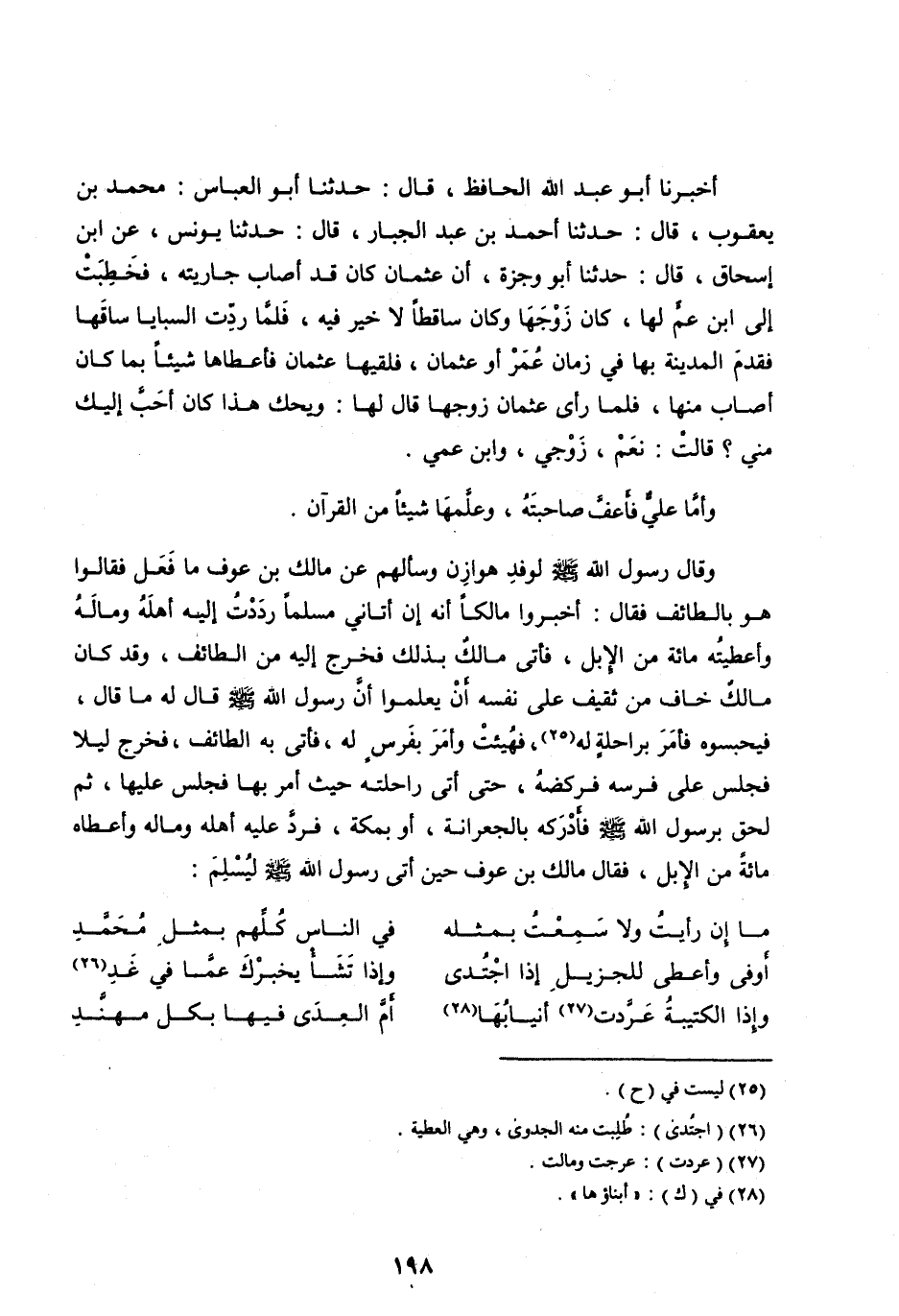 أَخْبَرَنَا أَبُو عَبْدِ اللهِ الْحَافِظُ، قَالَ: حَدَّثَنَا أَبُو الْعَبَّاسِ: مُحَمَّدُ بْنُ يَعْقُوبَ، قَالَ: حَدَّثَنَا أَحْمَدُ بْنُ عَبْدِ الْجَبَّارِ، قَالَ: حَدَّثَنَا يُونُسُ، عَنِ ابْنِ إِسْحَاقَ، قَالَ: حَدَّثَنَا أَبُو وَجْزَةَ، أَنَّ عُثْمَانَ كَانَ قَدْ أَصَابَ جَارِيَتَهُ، فَخُطِبَتْ إِلَى ابْنِ عَمٍّ لَهَا، كَانَ زَوْجَهَا وَكَانَ سَاقِطًا لَا خَيْرَ فِيهِ، فَلَمَّا رُدَّتِ السَّبَايَا سَاقَهَا فَقَدِمَ الْمَدِينَةَ بِهَا فِي زَمَانِ عُمَرَ أَوْ عُثْمَانَ، فَلَقِيَهَا عُثْمَانُ فَأَعْطَاهَا شَيْئًا بِمَا كَانَ أَصَابَ مِنْهَا، فَلَمَّا رَأَى عُثْمَانُ زَوْجَهَا قَالَ لَهَا: وَيْحَكِ هَذَا كَانَ أَحَبَّ إِلَيْكِ مِنِّي؟ قَالَتْ: نَعَمْ، زَوْجِي، وَابْنُ عَمِّي.