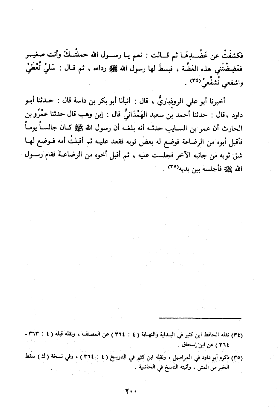 أَخْبَرَنَا أَبُو عَلِيٍّ الرُّوذْبَارِيُّ، قَالَ: أَنْبَأَنَا أَبُو بَكْرِ بْنُ دَاسَةَ قَالَ: حَدَّثَنَا أَبُو دَاوُدَ، قَالَ: حَدَّثَنَا أَحْمَدُ بْنُ سَعِيدٍ الْهَمْدَانِيُّ قَالَ: ابْنُ وَهْبٍ قَالَ حَدَّثَنَا عَمْرُو بْنُ الْحَارِثِ أَنَّ عُمَرَ بن السايب حَدَّثَهُ أَنَّهُ بَلَغَهُ أَنَّ رَسُولَ اللهِ صَلَّى اللهُ عَلَيْهِ وَسَلَّمَ كَانَ جَالِسًا يَوْمًا فَأَقْبَلَ أَبُوهُ مِنَ الرَّضَاعَةِ فَوَضَعَ لَهُ بَعْضَ ثَوْبِهِ فَقَعَدَ عَلَيْهِ ثُمَّ أَقْبَلَتْ أُمُّهُ فَوَضَعَ لَهَا شِقَّ ثَوْبِهِ مِنْ جَانِبِهِ الْآخَرِ فَجَلَسَتْ عَلَيْهِ، ثُمَّ أَقْبَلَ أَخُوهُ مِنَ الرَّضَاعَةِ فَقَامَ رَسُولُ اللهِ صَلَّى اللهُ عَلَيْهِ وَسَلَّمَ فَأَجْلَسَهُ بين يديه [ (35) ] .