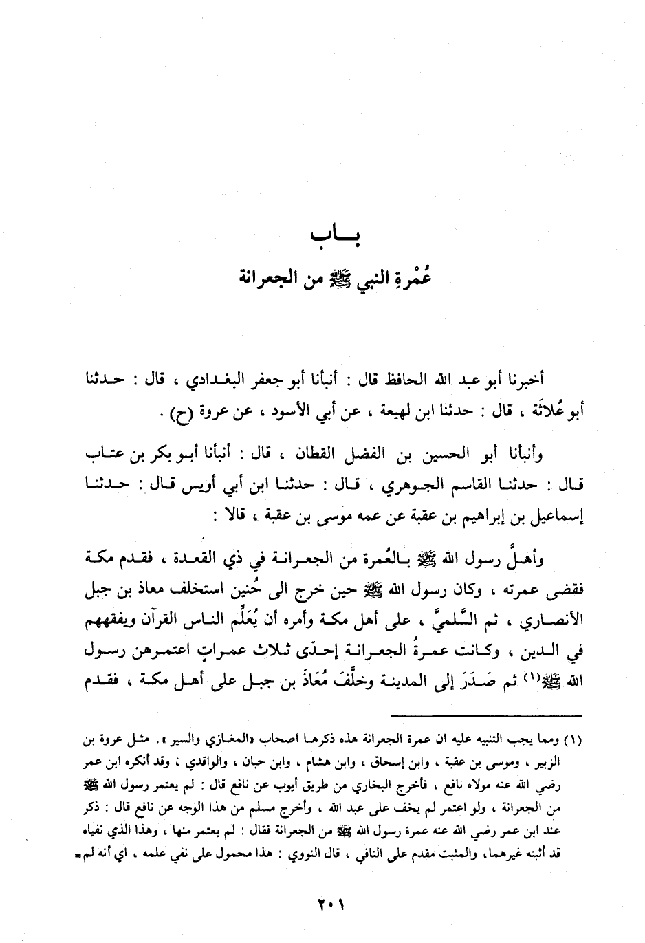 [ (1) ] ومما يجب التنبيه عليه ان عمرة الجعرانة هذه ذكرها اصحاب «المغازي والسير» . مثل عروة بن الزبير، وموسى بن عقبة، وابن إسحاق، وابن هشام، وابن حبان، والواقدي، وقد أنكره ابْنِ عُمَرَ رَضِيَ اللهُ عنه مولاه نافع، فأخرج البخاري من طريق أيوب عن نافع قال: لم يعتمر رسول الله صلى الله عَلَيْهِ وَسَلَّمَ مِنَ الْجِعْرَانَةِ، ولو اعتمر لم يخف على عبد الله، وأخرج مسلم من هذا الوجه عن نافع قال: ذكر عند ابْنِ عُمَرَ رَضِيَ اللهُ عنه عُمْرَةُ رَسُولِ اللهِ صَلَّى الله عَلَيْهِ وَسَلَّمَ مِنَ الْجِعْرَانَةِ فقال: لم يعتمر منها، وهذا الذي نفياه قد أثبته غيرهما، والمثبت مقدم على النافي، قال النووي: هذا محمول على نفي علمه، اي أنه لم