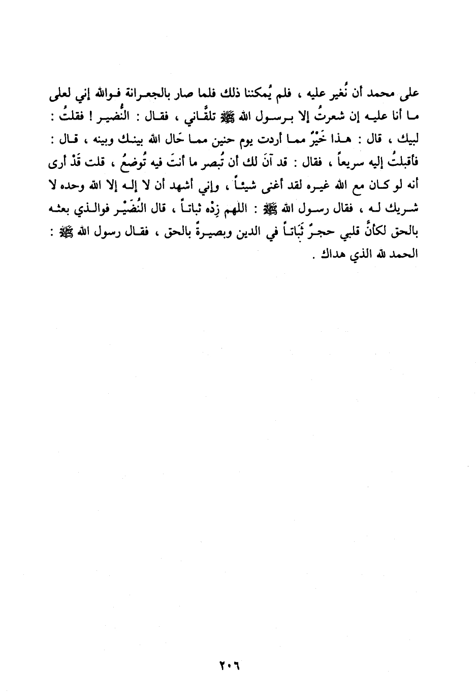 فَأَقْبَلْتُ إِلَيْهِ سَرِيعًا، فَقَالَ: قَدْ آنَ لَكَ أَنْ تُبْصِرَ مَا أَنْتَ فِيهِ تُوضَعُ، قُلْتُ قَدْ أَرَى أَنَّهُ لَوْ كَانَ مَعَ اللهِ غَيْرُهُ لَقَدْ أَغْنَى شَيْئًا، وإِنِّي أَشْهَدُ أَنْ لَا إِلَهَ إِلَّا اللهُ وَحْدَهُ لَا شَرِيكَ لَهُ، فَقَالَ رَسُولُ اللهِ صَلَّى اللهُ عَلَيْهِ وَسَلَّمَ: اللهُمَّ زِدْهُ ثَبَاتًا، قَالَ النُّضَيْرُ فو الذي بَعَثَهُ بِالْحَقِّ لَكَأَنَّ قَلْبِي حَجَرٌ ثَبَاتًا فِي الدِّينِ وَبَصِيرَةً بِالْحَقِّ، فَقَالَ رَسُولُ اللهِ صَلَّى اللهُ عَلَيْهِ وَسَلَّمَ: