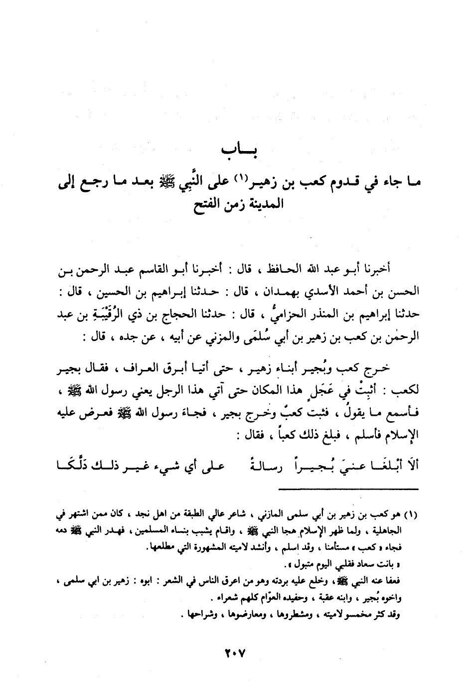 بَابُ مَا جَاءَ فِي قُدُومِ كَعْبِ بْنِ زُهَيْرٍ [ (1) ] عَلَى النَّبِيِّ صَلَّى اللهُ عَلَيْهِ وَسَلَّمَ بَعْدَ مَا رَجَعَ إِلَى الْمَدِينَةِ زَمَنَ الْفَتْحِ
