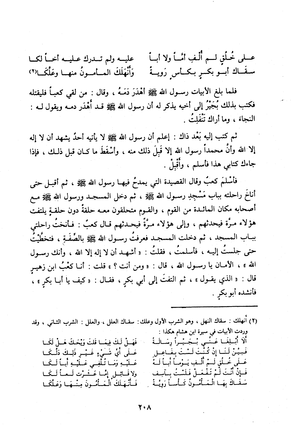 فَأَسْلَمَ كَعْبٌ وَقَالَ الْقَصِيدَةَ الَّتِي يَمْدَحُ فِيهَا رَسُولَ اللهِ صَلَّى اللهُ عَلَيْهِ وَسَلَّمَ، ثُمَّ أَقْبَلَ حَتَّى أَنَاخَ رَاحِلَتَهُ بِبَابِ مَسْجِدِ رَسُولِ اللهِ صَلَّى اللهُ عَلَيْهِ وَسَلَّمَ، ثُمَّ دَخَلَ الْمَسْجِدَ وَرَسُولُ اللهِ صَلَّى اللهُ عَلَيْهِ وَسَلَّمَ مَعَ أَصْحَابِهِ مَكَانَ الْمَائِدَةِ مِنَ الْقَوْمِ، وَالْقَوْمُ مُتَحَلِّقُونَ مَعَهُ حَلْقَةً دون حلقة يلتفت هَؤُلَاءِ مَرَّةً فَيُحَدِّثُهُمْ، وَإِلَى هَؤُلَاءِ مَرَّةً فَيُحَدِّثُهُمْ قَالَ كَعْبٌ: فَأَنَخْتُ رَاحِلَتِي بِبَابِ الْمَسْجِدِ، ثُمَّ دَخَلْتُ الْمَسْجِدَ فَعَرَفْتُ رَسُولَ اللهِ صَلَّى اللهُ عَلَيْهِ وَسَلَّمَ بِالصِّفَةِ، فَتَخَطَّيْتُ حَتَّى جَلَسْتُ إِلَيْهِ، فَأَسْلَمْتُ، فَقُلْتُ: «أَشْهَدُ أَنْ لَا إِلَهَ إِلَّا اللهُ، وَأَنَّكَ رَسُولُ اللهِ» ، الْأَمَانَ يَا رَسُولَ اللهِ، قَالَ: «وَمَنْ أَنْتَ؟» قُلْتُ: أَنَا كعب ابن زُهَيْرٍ قَالَ: «الَّذِي يَقُولُ» ، ثُمَّ الْتَفَتَ إِلَى أَبِي بَكْرٍ، فَقَالَ: «كَيْفَ يَا أَبَا بَكْرٍ» ، فَأَنْشَدَهُ أَبُو بكر.
