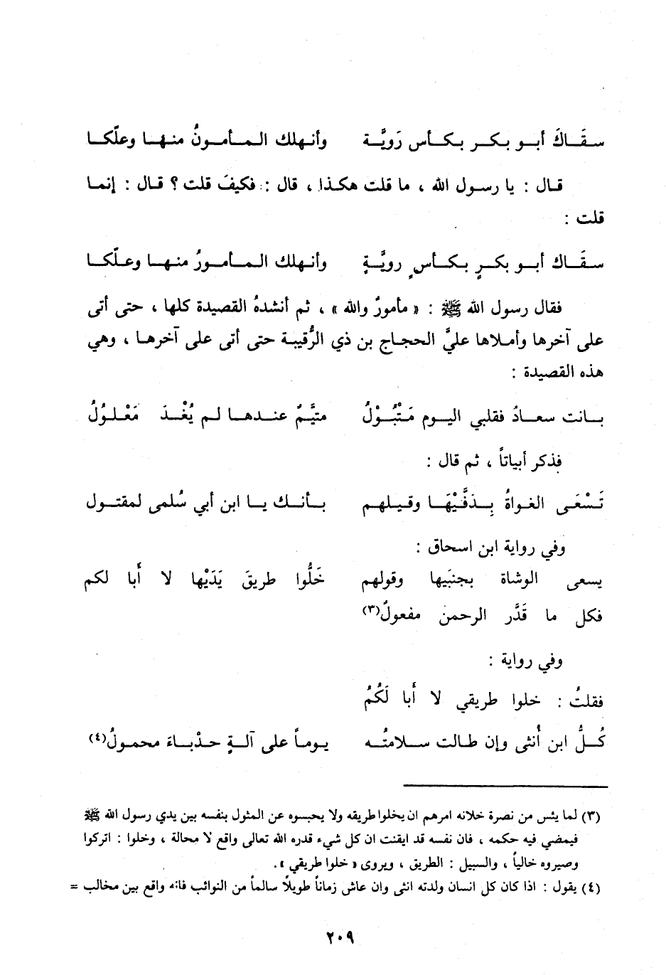 فَقَالَ رَسُولُ اللهِ صَلَّى الله عَلَيْهِ وَسَلَّمَ: «مَأْمُورٌ وَاللهِ» ، ثُمَّ أَنْشَدَهُ الْقَصِيدَةَ كُلَّهَا، حَتَّى أَتَى عَلَى آخِرِهَا وَأَمْلَاهَا عَلَيَّ الْحَجَّاجُ بْنُ ذِي الرُّقَيْبَةِ حَتَّى أَتَى عَلَى آخِرِهَا، وَهِيَ هَذِهِ القصيدة: