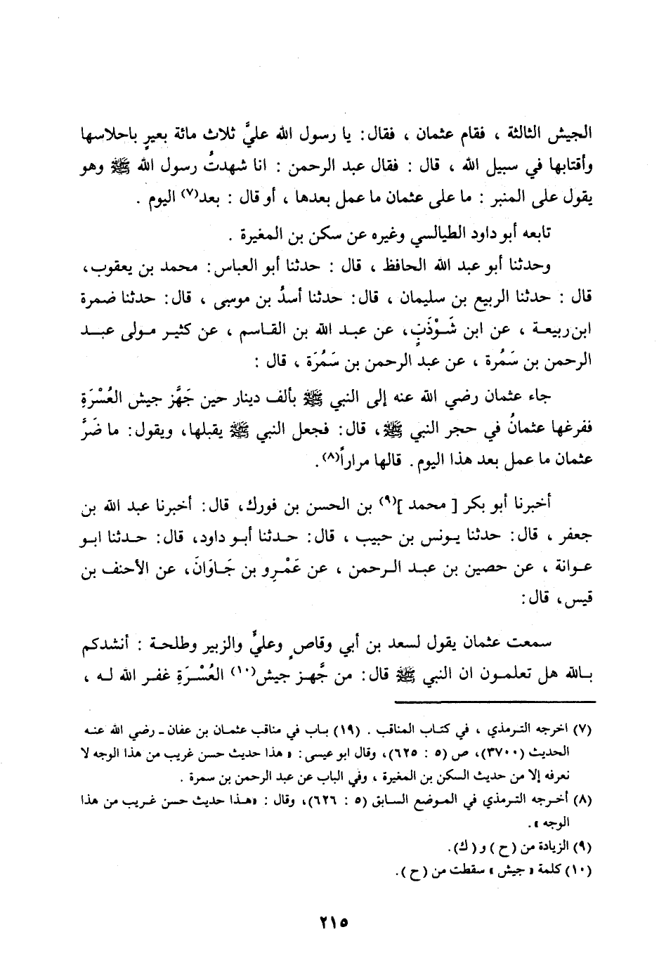 سَمِعْتُ عُثْمَانَ يَقُولُ لِسَعْدِ بْنِ أَبِي وَقَّاصٍ وَعَلِيٍّ وَالزُّبَيْرِ وَطَلْحَةَ: أَنْشُدُكُمْ بِاللهِ هَلْ تَعْلَمُونَ أَنَّ النَّبِيَّ صَلَّى اللهُ عَلَيْهِ وَسَلَّمَ قَالَ: مَنْ جَهَّزَ جَيْشَ [ (10) ] الْعُسْرَةِ غَفَرَ اللهُ لَهُ،
