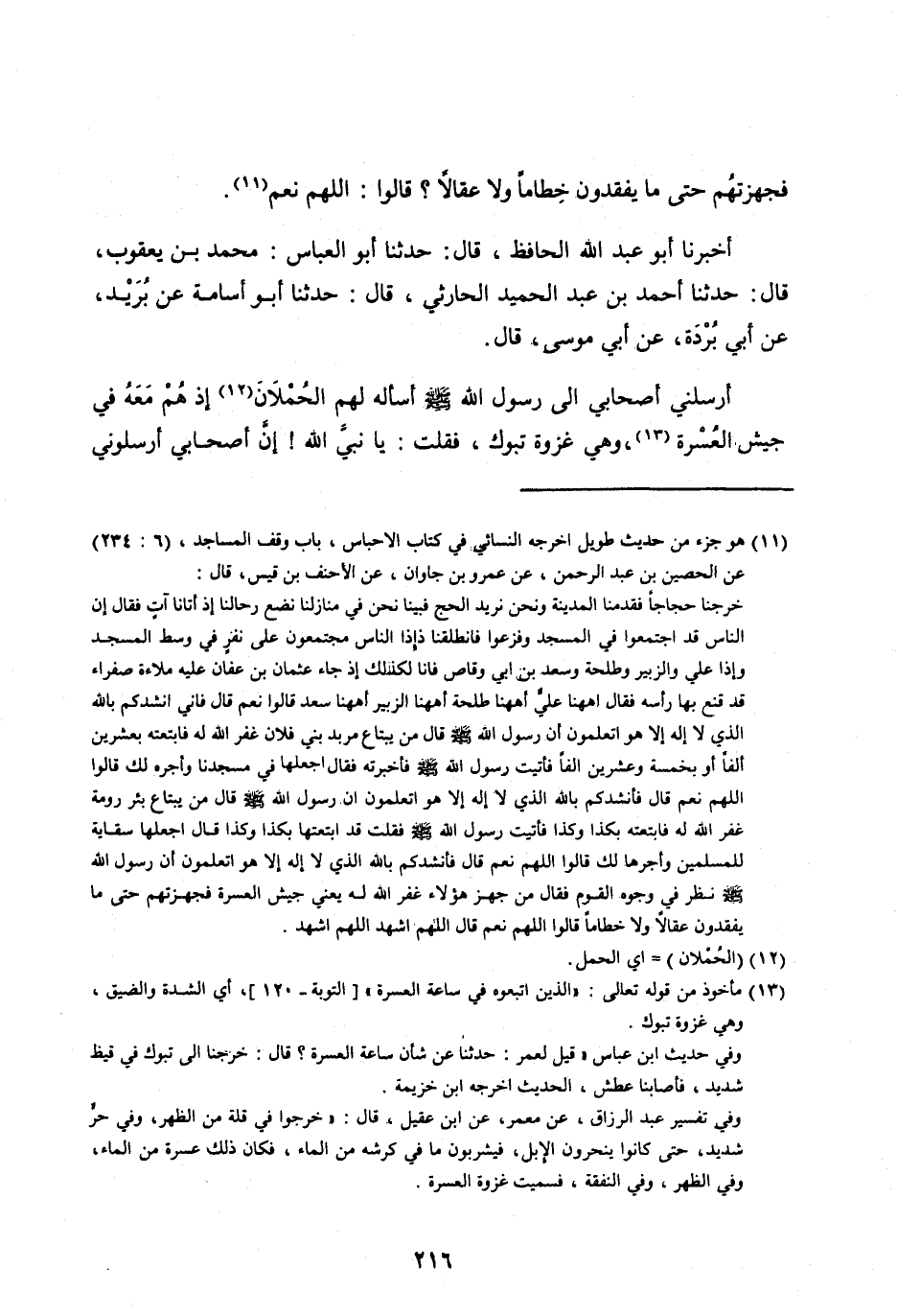 فَجَهَّزْتُهُمْ حَتَّى مَا يَفْقِدُونَ خِطَامًا وَلَا عِقَالًا؟ قَالُوا: اللهُمَّ نَعَمْ [ (11) ] .