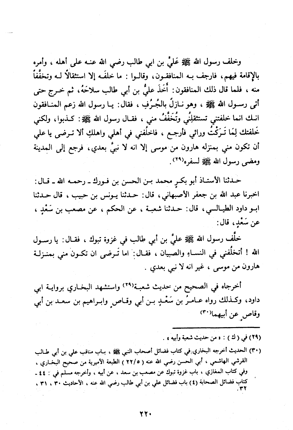 [ (30) ] الحديث أخرجه البخاري في كتاب فضائل أصحاب النبي صلى الله عليه وسلم، باب مناقب علي بن أبي طالب القرشي الهاشمي، أبي الحسن رضي الله عنه (5/ 22) الطبعة الأميرية من صحيح البخاري، وفي كتاب المغازي، باب غزوة تبوك عَنْ مُصْعَبِ بْنِ سَعْدٍ، عَنْ أَبِيهِ، وأخرجه مسلم فِي: 44- كِتَابِ فَضَائِلِ الصَّحَابَةِ (4) باب فضائل علي بن أبي طالب رضي الله عنه، الأحاديث 30، 31، 32.