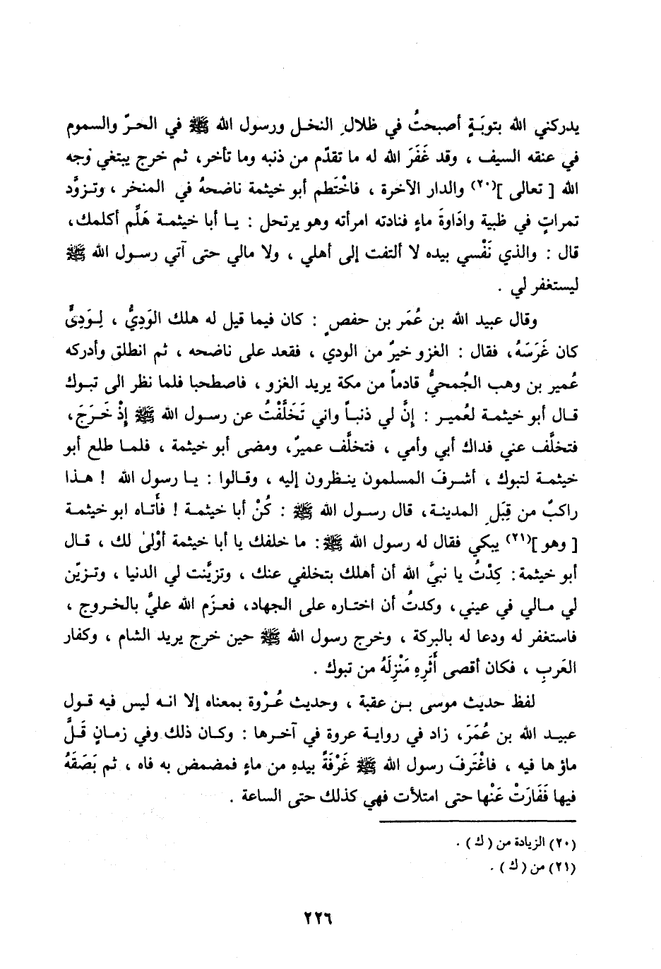 وَقَالَ عُبَيْدُ اللهِ بْنُ عُمَرَ بْنِ حَفْصٍ: كَانَ فِيمَا قِيلَ لَهُ هَلَكَ الْوَدِيُّ، لِوَدِيٍّ كَانَ غَرَسَهُ، فَقَالَ: الْغَزْوُ خَيْرٌ مِنَ الْوَدِيِّ، فَقَعَدَ عَلَى نَاضِحِهِ، ثُمَّ انْطَلَقَ وَأَدْرَكَهُ عُمَيْرُ بْنُ وَهْبٍ الْجُمَحِيُّ قَادِمًا مِنْ مَكَّةَ يُرِيدُ الْغَزْوَ، فَاصْطَحَبَا فَلَمَّا نَظَرَ إِلَى تَبُوكَ قَالَ أَبُو خَيْثَمَةَ لِعُمَيْرٍ: إِنَّ لِي ذَنْبًا وَإِنِّي تَخَلَّفْتُ عَنْ رَسُولِ اللهِ صَلَّى اللهُ عَلَيْهِ وَسَلَّمَ إِذْ خَرَجَ، فَتَخَلَّفْ عَنِّي فِدَاكَ أَبِي وَأُمِّي، فَتَخَلَّفَ عُمَيْرٌ، وَمَضَى أَبُو خَيْثَمَةَ، فَلَمَّا طَلَعَ أَبُو خَيْثَمَةَ لِتَبُوكَ، أَشْرَفَ الْمُسْلِمُونَ يَنْظُرُونَ إِلَيْهِ، وَقَالُوا: يَا رَسُولَ اللهِ! هَذَا رَاكِبٌ مِنْ قِبَلِ الْمَدِينَةِ، قَالَ رَسُولُ اللهِ صَلَّى اللهُ عَلَيْهِ وَسَلَّمَ: كُنْ أَبَا خَيْثَمَةَ! فَأَتَاهُ أَبُو خَيْثَمَةَ [وَهُوَ] [ (21) ] يَبْكِي فَقَالَ لَهُ رَسُولُ اللهِ صَلَّى اللهُ عَلَيْهِ وسلم: مَا خَلَّفَكَ يَا أَبَا خَيْثَمَةَ أَوْلَى لَكَ، قَالَ أَبُو خَيْثَمَةَ: كِدْتُ يَا نَبِيَّ اللهِ إِنَّ أَهْلِكَ بِتَخَلُّفِي عَنْكَ، وَتَزَيَّنَتْ لِيَ الدُّنْيَا، وَتَزَيَّنَ لِي مَالِي فِي عَيْنِي، وَكِدْتُ أَنْ أَخْتَارَهُ عَلَى الْجِهَادِ، فَعَزَمَ اللهُ عَلَيَّ بِالْخُرُوجِ، فَاسْتَغْفَرَ لَهُ وَدَعَا لَهُ بِالْبَرَكَةِ، وَخَرَجَ رَسُولُ اللهِ صَلَّى اللهُ عَلَيْهِ وَسَلَّمَ حِينَ خَرَجَ يُرِيدُ الشَّامَ، وَكُفَّارَ الْعَرَبِ، فَكَانَ أَقْصَى أَثَرِهِ مَنْزِلَهُ مِنْ تَبُوكَ.