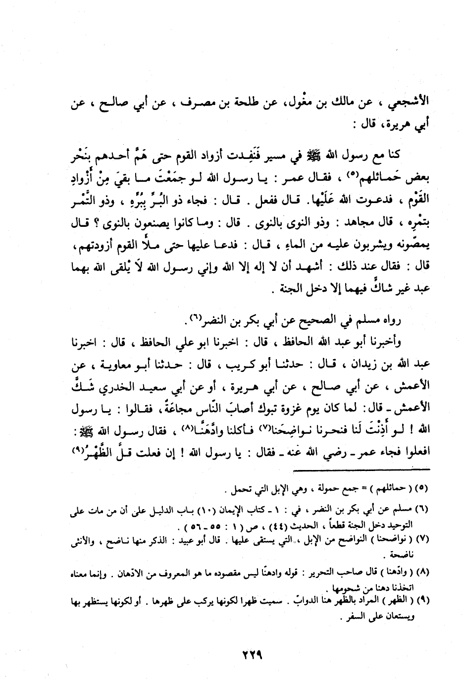 الْأَشْجَعِيُّ، عَنْ مَالِكِ بْنِ مِغْوَلٍ، عَنْ طَلْحَةَ بْنِ مُصَرِّفٍ، عَنْ أَبِي صَالِحٍ، عَنْ أَبِي هُرَيْرَةَ، قَالَ: كُنَّا مَعَ رَسُولِ اللهِ صَلَّى اللهُ عَلَيْهِ وسلم فِي مَسِيرٍ فَنَفِدَتْ أَزْوَادُ الْقَوْمِ حَتَّى هَمَّ أَحَدُهُمْ بِنَحْرِ بَعْضِ حَمَائِلِهِمْ [ (5) ] ، فَقَالَ عُمَرُ: يَا رَسُولَ اللهِ لَوْ جَمَعْتَ مَا بَقِيَ مِنْ أَزْوَادِ الْقَوْمِ، فَدَعَوْتَ اللهَ عَلَيْهَا. قَالَ فَفَعَلَ. قَالَ: فَجَاءَ ذُو الْبُرِّ بِبُرِّهِ، وَذُو التَّمْرِ بِتَمْرِهِ، قَالَ مُجَاهِدٌ: وَذُو النَّوَى بِالنَّوَى. قَالَ: وَمَا كَانُوا يَصْنَعُونَ بِالنَّوَى؟ قَالَ يَمُصُّونَهُ وَيَشْرَبُونَ عَلَيْهِ مِنَ الْمَاءِ، قَالَ: فَدَعَا عَلَيْهَا حَتَّى مَلَأَ الْقَوْمُ أَزْوِدَتَهُمْ، قَالَ: فَقَالَ عِنْدَ ذَلِكَ: أَشْهَدُ أَنْ لَا إِلَهَ إِلَّا اللهُ وَأَنِّي رَسُولُ اللهِ لَا يَلْقَى اللهَ بِهِمَا عَبْدٌ غَيْرَ شَاكٍّ فِيهِمَا إِلَّا دَخَلَ الْجَنَّةُ.