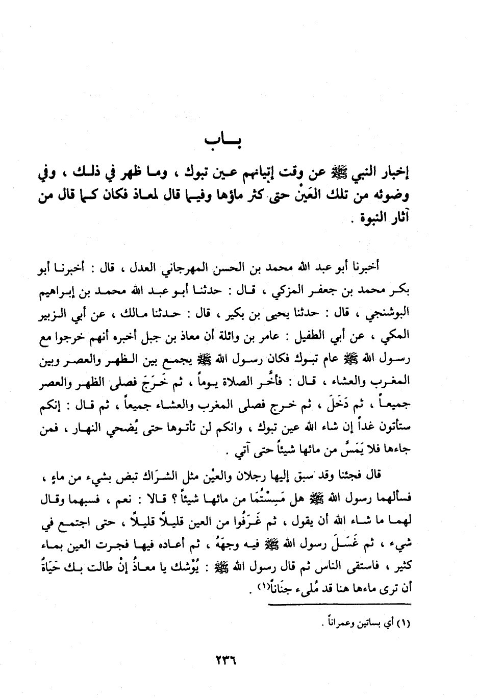 قَالَ فَجِئْنَا وَقَدْ سَبَقَ إِلَيْهَا رَجُلَانِ وَالْعَيْنُ مِثْلُ الشِّرَاكِ تَبِضُّ بِشَيْءٍ مِنْ مَاءٍ، فَسَأَلَهُمَا رَسُولُ اللهِ صَلَّى اللهُ عَلَيْهِ وَسَلَّمَ هَلْ مَسِسْتُمَا مِنْ مَائِهَا شَيْئًا؟ قَالَا: نَعَمْ، فَسَبَّهُمَا وَقَالَ لَهُمَا مَا شَاءَ اللهُ أَنْ يَقُولَ، ثُمَّ غَرَفُوا مِنَ الْعَيْنِ قَلِيلًا قَلِيلًا، حَتَّى اجْتَمَعَ فِي شَيْءٍ، ثُمَّ غَسَلَ رَسُولُ اللهِ صَلَّى اللهُ عَلَيْهِ وَسَلَّمَ فِيهِ وَجْهَهُ، ثُمَّ أَعَادَهُ فِيهَا فَجَرَتِ الْعَيْنُ بِمَاءٍ كَثِيرٍ، فَاسْتَقَى النَّاسُ ثُمَّ قَالَ رَسُولُ اللهِ صَلَّى اللهُ عَلَيْهِ وَسَلَّمَ: يُوشِكُ يَا مُعَاذُ إِنْ طَالَتْ بِكَ حَيَاةٌ أَنْ تَرَى مَاءَهَا هُنَا قَدْ مُلِئَ جِنَانًا [ (1) ] .
