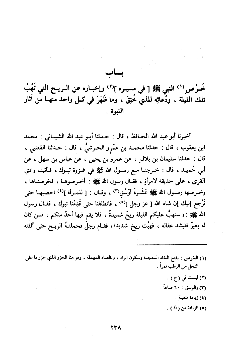 أَخْبَرَنَا أَبُو عَبْدِ اللهِ الْحَافِظُ، قَالَ: حَدَّثَنَا أَبُو عَبْدِ اللهِ الشَّيْبَانِيُّ: مُحَمَّدُ ابن يَعْقُوبَ، قَالَ: حَدَّثَنَا مُحَمَّدُ بْنُ عَمْرٍو الْحَرَشِيُّ، قَالَ: حَدَّثَنَا الْقَعْنَبِيُّ، قَالَ: حَدَّثَنَا سُلَيْمَانُ بْنُ بِلَالٍ، عَنْ عَمْرِو بْنِ يَحْيَى، عَنْ عَبَّاسِ بْنِ سَهْلٍ، عَنْ أَبِي حُمَيْدٍ، قَالَ: خَرَجْنَا مَعَ رَسُولِ اللهِ صَلَّى اللهُ عَلَيْهِ وَسَلَّمَ فِي غَزْوَةِ تَبُوكَ، فَأَتَيْنَا وَادِيَ الْقُرَى، عَلَى حَدِيقَةٍ لِامْرَأَةٍ، فَقَالَ رَسُولُ اللهِ صَلَّى اللهُ عَلَيْهِ وَسَلَّمَ: اخْرُصُوهَا، فَخَرَصْنَاهَا، وَخَرَصَهَا رَسُولُ اللهِ صلى الله عليه وسلم عَشَرَةَ أَوْسُقٍ [ (3) ] ، وَقَالَ: [لِلْمَرْأَةِ] [ (4) ] أَحْصِيهَا حَتَّى نَرْجِعَ إِلَيْكَ إِنْ شَاءَ اللهُ [عَزَّ وَجَلَّ] [ (5) ] ، فَانْطَلَقْنَا حَتَّى قَدِمْنَا تَبُوكَ، فَقَالَ رَسُولُ اللهِ صَلَّى الله عليه وسلم: «سَتَهُبُّ عَلَيْكُمُ اللَّيْلَةَ رِيحٌ شَدِيدَةٌ، فَلَا يَقُمْ فِيهَا أَحَدٌ مِنْكُمْ، فَمَنْ كَانَ لَهُ بَعِيرٌ فَلْيَشُدَّ عِقَالَهُ، فهبّت ريخ شَدِيدَةٌ، فَقَامَ رَجُلٌ فَحَمَلَتْهُ الرِّيحُ حَتَّى أَلْقَتْهُ