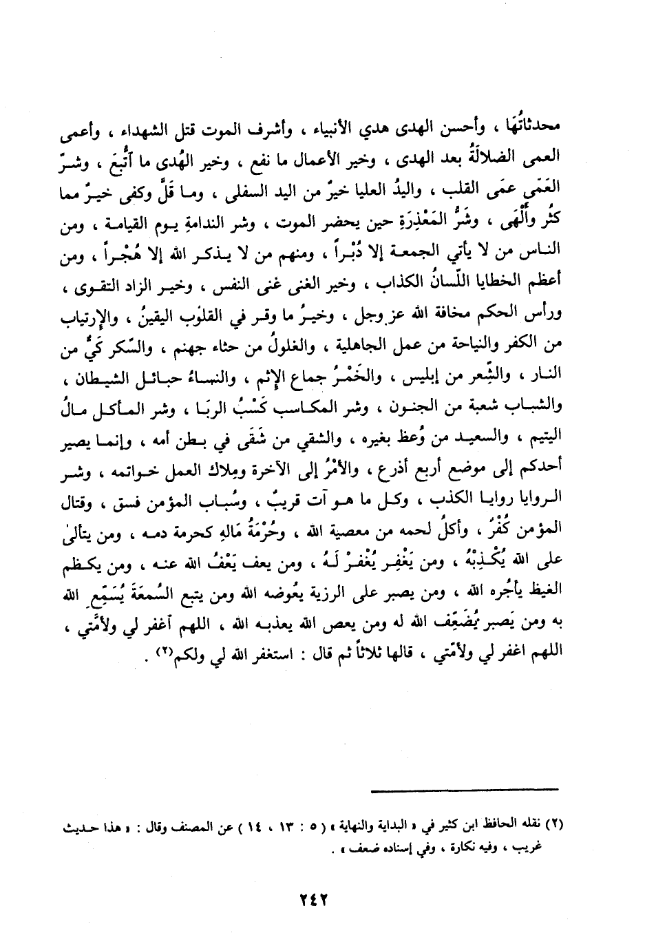 مُحْدَثَاتُهَا، وَأَحْسَنَ الْهَدْيِ هَدْيُ الْأَنْبِيَاءِ، وَأَشْرَفَ الْمَوْتِ قَتْلُ الشُّهَدَاءِ، وَأَعْمَى الْعَمَى الضَّلَالَةُ بَعْدَ الْهُدَى، وَخَيْرَ الْأَعْمَالِ مَا نَفَعَ، وَخَيْرَ الْهُدَى مَا اتُّبِعَ، وَشَرَّ الْعَمَى عَمَى الْقَلْبِ، وَالْيَدُ الْعُلْيَا خَيْرٌ مِنَ الْيَدِ السُّفْلَى، وَمَا قَلَّ وَكَفَى خَيْرٌ مِمَّا كَثُرَ وَأَلْهَى، وَشَرُّ الْمَعْذِرَةِ حِينَ يَحْضُرُ الْمَوْتُ، وَشَرُّ النَّدَامَةِ يَوْمُ الْقِيَامَةِ، وَمِنَ النَّاسِ مَنْ لَا يَأْتِي الْجُمُعَةَ إِلَّا دَبْرًا، وَمِنْهُمْ مَنْ لَا يَذْكُرُ اللهَ إِلَّا هَجْرًا، وَمِنَ أَعْظَمِ الْخَطَايَا اللِّسَانُ الْكَذَّابُ، وَخَيْرُ الْغِنَى غِنَى النَّفْسِ، وَخَيْرُ الزَّادِ التَّقْوَى، وَرَأْسُ الْحِكَمِ مَخَافَةُ اللهِ عَزَّ وَجَلَّ، وَخَيْرُ مَا وَقَرَ فِي الْقُلُوبِ الْيَقِينُ، وَالِارْتِيَابُ مِنَ الْكُفْرِ وَالنِّيَاحَةُ مِنْ عَمَلِ الْجَاهِلِيَّةِ، وَالْغُلُولُ مِنْ حثاء جهنم، والسّكركيّ مِنَ النَّارِ، وَالشِّعْرُ مِنْ إِبْلِيسَ، وَالْخَمْرُ جُمَّاعُ الْإِثْمِ، وَالنِّسَاءُ حَبَائِلُ الشَّيْطَانِ، وَالشَّبَابُ شُعْبَةٌ مِنَ الْجُنُونِ، وَشَرُّ الْمَكَاسِبِ كَسْبُ الرِّبَا، وَشَرُّ الْمَأْكَلِ مَالُ الْيَتِيمِ، وَالسَّعِيدُ مَنْ وُعِظَ بِغَيْرِهِ، وَالشَّقِيُّ مَنْ شَقِيَ فِي بَطْنِ أُمِّهِ، وَإِنَّمَا يَصِيرُ أَحَدُكُمْ إِلَى مَوْضِعِ أَرْبَعِ أَذْرُعٍ، وَالْأَمْرُ إِلَى الْآخِرَةِ وَمِلَاكُ الْعَمَلِ خَوَاتِمُهُ، وَشَرُّ الرَّوَايَا رَوَايَا الْكَذِبِ، وَكُلُّ مَا هُوَ آتٍ قَرِيبٌ، وَسِبَابُ الْمُؤْمِنِ فِسْقٌ، وَقِتَالُ الْمُؤْمِنِ كُفْرٌ، وَأَكْلُ لَحْمِهِ مِنْ مَعْصِيَةِ اللهِ، وَحُرْمَةُ مَالِهِ كَحُرْمَةِ دَمِهِ، وَمَنْ يَتَأَلَّى عَلَى اللهِ يُكْذِبْهُ، وَمَنْ يَغْفِرْ يُغْفَرْ لَهُ، وَمَنْ يَعْفُ يَعْفُ اللهُ عَنْهُ، وَمَنْ يَكْظِمِ الْغَيْظَ يَأْجُرْهُ اللهُ، وَمَنْ يَصْبِرْ عَلَى الرَّزِيَّةِ يُعَوِّضْهُ اللهُ وَمَنْ يَتْبَعِ السُّمْعَةَ يُسَمِّعِ اللهُ بِهِ وَمَنْ يَصْبِرْ يُضَعِّفِ اللهُ لَهُ وَمَنْ يَعْصِ اللهَ يُعَذِّبْهُ اللهُ، اللهُمَّ اغْفِرْ لِي وَلِأُمَّتِي، اللهُمَّ اغْفِرْ لِي وَلِأُمَّتِي، قَالَهَا ثَلَاثًا ثُمَّ قَالَ: أَسْتَغْفِرُ اللهَ لِي ولكم [ (2) ] .