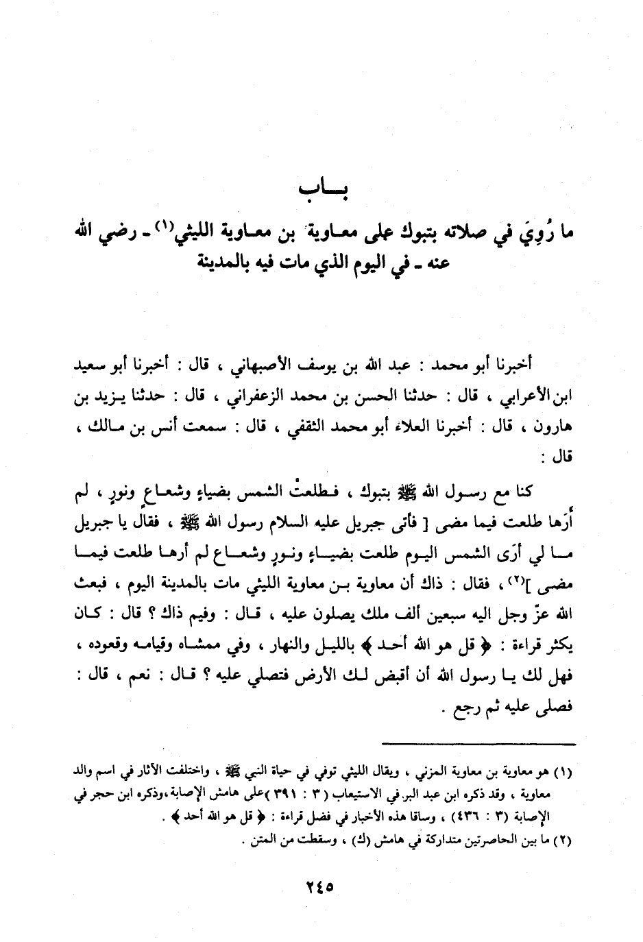 كُنَّا مَعَ رَسُولِ اللهِ صَلَّى اللهُ عليه وسلم بِتَبُوكَ، فَطَلَعَتِ الشَّمْسُ بِضِيَاءٍ وَشُعَاعٍ وَنُورٍ، لَمْ أَرَهَا طَلَعَتْ فِيمَا مَضَى [فَأَتَى جِبْرِيلُ عَلَيْهِ السَّلَامُ رَسُولَ اللهِ صَلَّى اللهُ عَلَيْهِ وَسَلَّمَ، فَقَالَ يَا جِبْرِيلُ مَا لِي أَرَى الشَّمْسَ الْيَوْمَ طَلَعَتْ بِضِيَاءٍ وَنُورٍ وَشُعَاعٍ لَمْ أَرَهَا طَلَعَتْ فِيمَا مَضَى] [ (2) ] ، فَقَالَ: ذَاكَ أَنَّ مُعَاوِيَةَ بْنَ مُعَاوِيَةَ اللَّيْثِيَّ مَاتَ بِالْمَدِينَةِ الْيَوْمَ، فَبَعَثَ اللهُ عَزَّ وَجَلَّ إِلَيْهِ سَبْعِينَ أَلْفَ مَلَكٍ يُصَلُّونَ عَلَيْهِ، قَالَ: وَفِيمَ ذَاكَ؟ قَالَ: كَانَ يُكْثِرُ قِرَاءَةَ: (قُلْ هُوَ اللَّهُ أَحَدٌ) بِاللَّيْلِ وَالنَّهَارِ، وَفِي مَمْشَاهُ وَقِيَامِهِ وَقُعُودِهِ، فَهَلْ لَكَ يَا رَسُولَ اللهِ أَنْ أَقْبِضَ لَكَ الْأَرْضَ فَتُصَلِّيَ عَلَيْهِ؟ قَالَ: نَعَمْ، قَالَ: