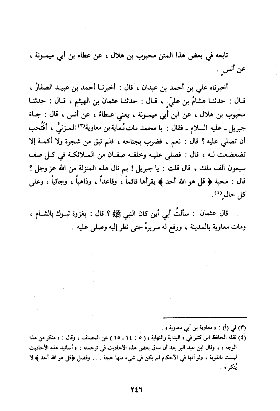 أَخْبَرَنَاهُ عَلِيُّ بْنُ أَحْمَدَ بْنِ عَبْدَانَ، قَالَ: أَخْبَرَنَا أَحْمَدُ بْنُ عُبَيْدٍ الصَّفَّارُ، قَالَ: حَدَّثَنَا هِشَامُ بْنُ عَلِيٍّ، قَالَ: حَدَّثَنَا عُثْمَانُ بْنُ الْهَيْثَمِ، قَالَ: حَدَّثَنَا مَحْبُوبُ بْنُ هِلَالٍ، عَنِ ابْنِ أَبِي مَيْمُونَةَ، يَعْنِي عَطَاءً، عَنْ أَنَسٍ، قَالَ: جَاءَ جِبْرِيلُ- عَلَيْهِ السَّلَامُ- فَقَالَ: يَا مُحَمَّدُ مات معاية بْنُ مُعَاوِيَةَ [ (3) ] الْمُزَنِيُّ، أَفَتُحِبُّ أَنْ تُصَلِّيَ عَلَيْهِ؟ قَالَ: نَعَمْ، فَضَرَبَ بِجَنَاحِهِ، فَلَمْ تَبْقَ مِنْ شَجَرَةٍ وَلَا أَكَمَةٍ إِلَّا تَضَعْضَعَتْ لَهُ، قَالَ: فَصَلَّى عَلَيْهِ وَخَلْفَهُ صَفَّانِ مِنَ الْمَلَائِكَةِ فِي كُلِّ صَفٍّ سَبْعُونَ أَلْفَ مَلَكٍ، قَالَ قُلْتُ: يَا جِبْرِيلُ! بِمَ نَالَ هَذِهِ الْمَنْزِلَةَ مِنَ اللهِ عَزَّ وَجَلَّ؟